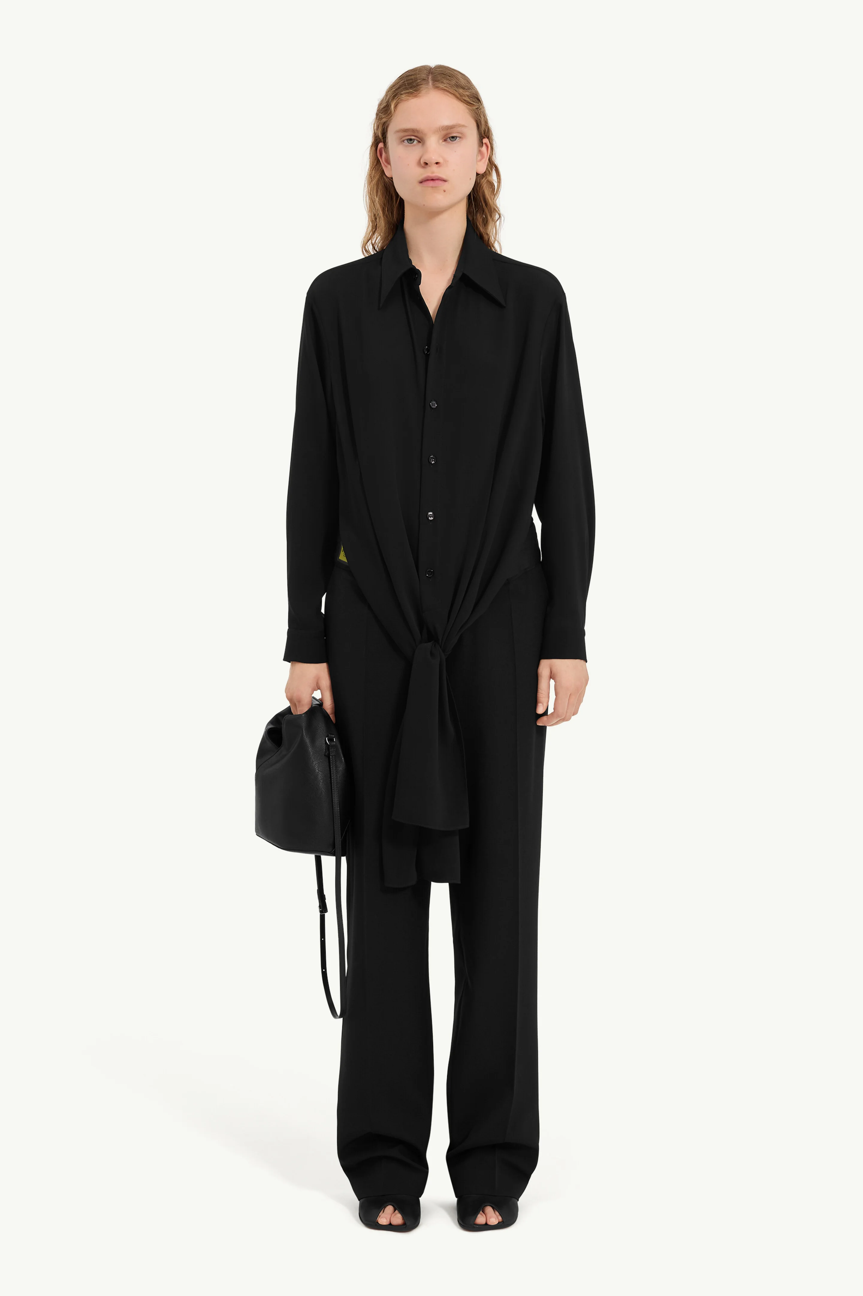 A fluid blouse that effortlessly balances structure and movement. Its button-down front and crisp collar exude classic tailoring, while the artfully draped front panel offers versatile styling – knotted at the waist for a sculptural silhouette or left loose for undone ease. The cropped, open-back detail injects a modern edge, subtly finished with the signature MM6 white stitch line. Product Details Item ID S52DT0049S43455900 Primary fabric: 100% polyester Waist tie front detail Long sleeves Shirt collar Button front closure Backless design White stitch line at the back Made in Italy