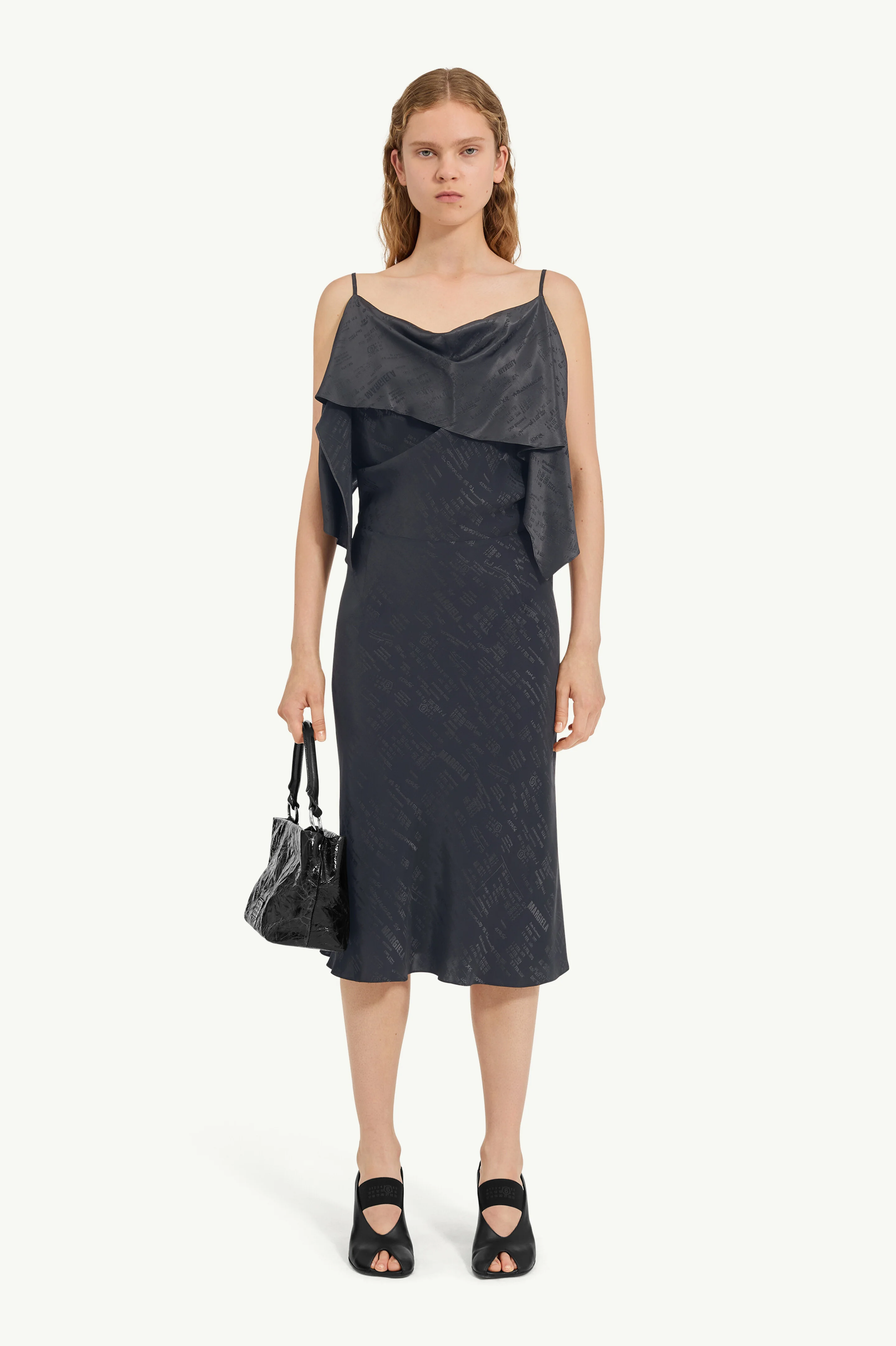 Crafted in jacquard satin with tonal text, this slip dress channels nostalgia through its mix of stamped graphics and handwritten notes, reminiscent of vintage library texts. The layered drape can be folded or unfolded for versatile styling, amplifying the sculptural finish. Product Details Item ID S52DD0082M35737002J Primary fabric: 58% acetate 42% viscose-rayon Viscose blend jacquard Midi length Draped layered front Sleeveless Scoop neck Backless Side zipper closure White stitch line at the back Made in Italy
