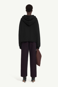 A play on proportions and texture. This hooded sweatshirt reinterprets a wardrobe staple with raw, undone edges and a boxy fit. The MM6 numeric patch punctuates the chest, reinforcing the Maison's deconstructed approach to casualwear, while the white stitch line at the back adds its quiet signature. Product Details Item ID S52GU0234M25025900 Primary fabric: 100% Cotton Drop shoulder boxy hoodie with raw hem Boxy silhouette with dropped shoulders Hood with adjustable drawstrings Kangaroo pocket at the front Raw, frayed hemline detailing Long sleeves, ribbed cuffs Small logo patch centered on chest White stitch line at the back Model is 180 cm tall and wears a size M.