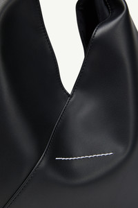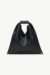 Japanese bag classic mini in PU leather. First introduced as part of the Autumn-Winter 2009 collection, the Japanese bag has since become MM6’s most emblematic accessory. Its distinctive triangular silhouette is inspired by the Japanese art of paper folding: origami. The buttons at its edges allow for the bag to change form through folding, evoking the Maison’s deconstructionist design codes. Each season, the Japanese bag is reinterpreted in additional sizes and a variety of innovative fabrics, rendering the accessory timeless. Product Details Item ID SB6WD0013P4313T8013 Outer: 100% Faux leather Contrast: 100% Leather Lining: 100% Nylon All-over logo lining Two different sections sewn together Two snap buttons on the bottom to change the shape of the bag Leather cuff with numeric logo White stitch line at the back Button closure on leather detail Inside pocket with button closure Internal black label with white logo