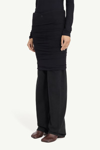 Classic five-pocket jeans are “trapped” beneath layers of stocking-like mesh, which can be worn long or reshaped into a ruched skirt. The sheer overlay stretches and gathers, distorting the outline of the denim and subverting the expected silhouette. The MM6 numeric signature and white stitch line appears at the back Product Details Item ID S62LB0206M30011971 Primary fabric: 100% Cotton Secondary fabric: 90% Polyamide, 10% Elastane Five-pocket denim trousers Layered with ruched stretch mesh Concealed front fastening and belt loopsl Made in Italy Model is 178 cm tall and wears a size 28.