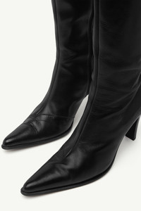 Tall boots in smooth black leather, shaped with a refined curve from toe to calf. The elongated shaft is balanced by a pointed toe and high block heel – an interplay of verticality and structure. Discreetly signed with the MM6 white stitch line at the back. Product Details Item ID S66WW0098P7437T8013 Primary material: 100% Calf leather Glossy knee-high boots Pointed toe Exposed seam detail Zip fastening on the inner side White stitch line at the back Made in Italy
