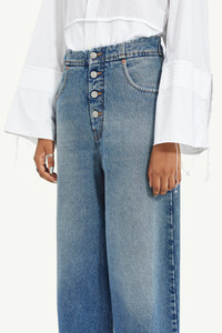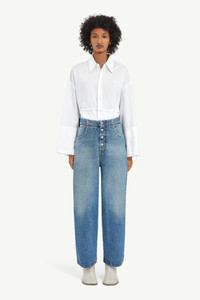 Cut from cotton denim and featuring a straight leg and button closure, MM6’s light blue denim trousers are modelled after retro styles, using a vintage treatment. The brand’s discreet yet distinct signature, a horizontal line of white stitches, is found on the back of the garment. Product Details Item ID S52LA0226S30589965 Composition: 100% cotton Pocket lining: 65% polyester, 35% cotton Blue denim trousers with vintage treatment Straight leg Button closure White stitch line and MM6 numeric signature jacron label at the back Made in Italy Model is 176 cm tall and wears a size 28.