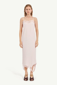 A slip dress in soft fabric with tonal lace edging the neckline and hem. The silhouette is subtly inverted, giving the impression of a mirrored garment. At the back, a slit and button closure refine the construction, while the MM6 white stitch line discreetly asserts its signature. Product Details Item ID S52DD0075M35731231 Primary fabric: 62% viscose-rayon 38% cotton Midi length Lace trim at neckline and hem Sleeveless Sweetheart neck Button closure at the back White stitch line at the back Made in Italy