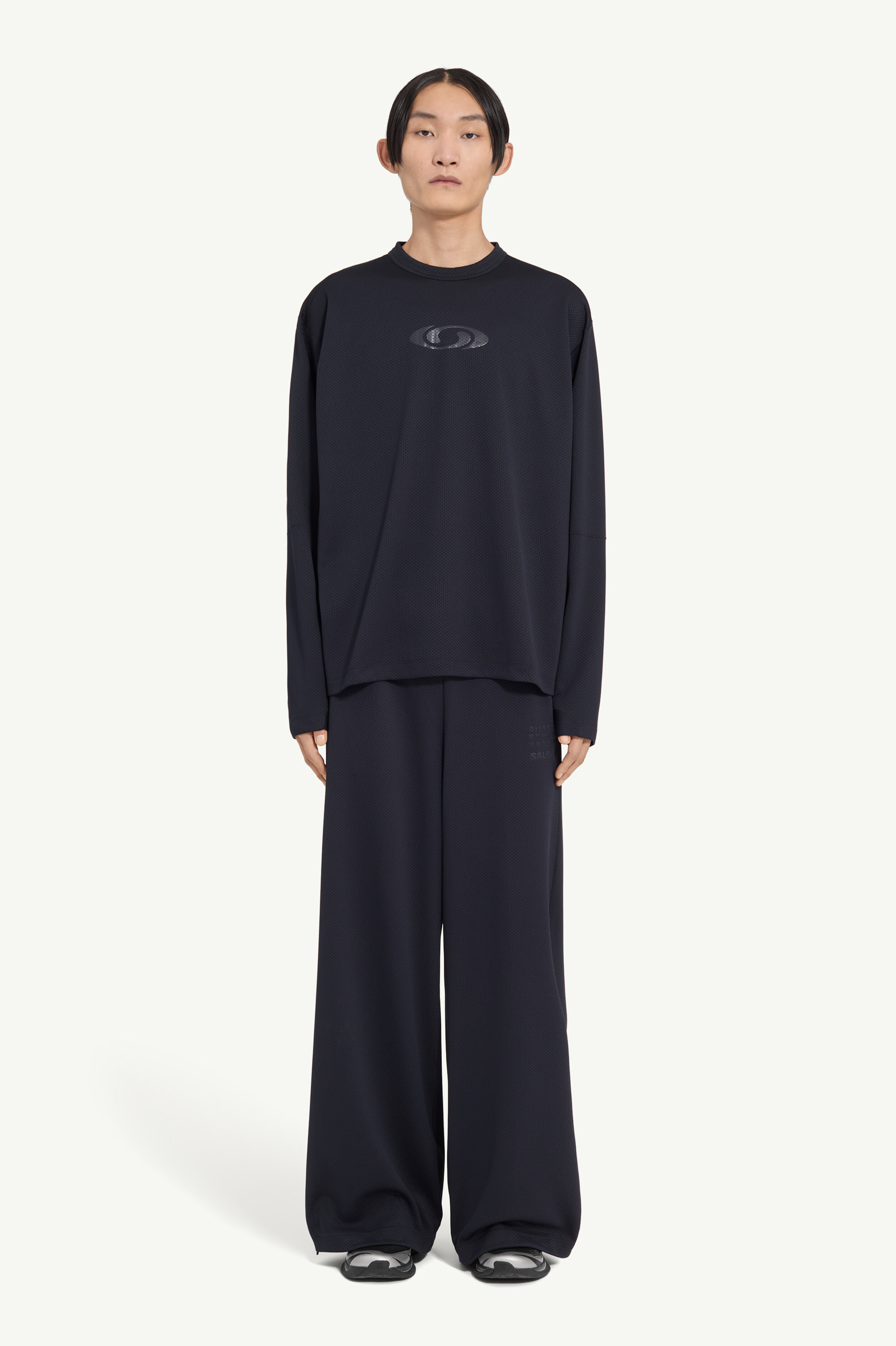 Perforated mesh and an easy, oversized cut redefine this long-sleeve layer with a directional stance. A tonal Salomon emblem floats at the chest, adding dimensional subtlety, while MM6’s numeric artwork and signature white stitch line reassert the garment’s conceptual origin. Product Details Item ID SH0NH0020M20139899 Primary Fabric: 100% Polyester Long-sleeve technical top in perforated mesh Tonal Salomon signature across the chest MM6 x Salomon artwork at the back neckline White stitch line at the back Model is 190 cm tall and wears a size L.