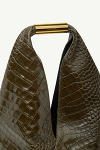 The Japanese bag in crocodile-embossed faux leather is a sculptural evolution of MM6’s most emblematic accessory. First introduced for Spring-Summer 2024, its angular folds echo the original’s origami inspiration, while the spacious silhouette offers room for everyday essentials. On the handle, the Maison's numeric signature asserts its identity. Product Details Item ID SB6WD0043P8650T7415 Primary material: 100% Calf leather Secondary material: 100% Cotton Metallic hardware Japanese Bag in crocodile-embossed faux leather Folded silhouette with angular construction Brass handle with engraved logo White stitch line at the back
