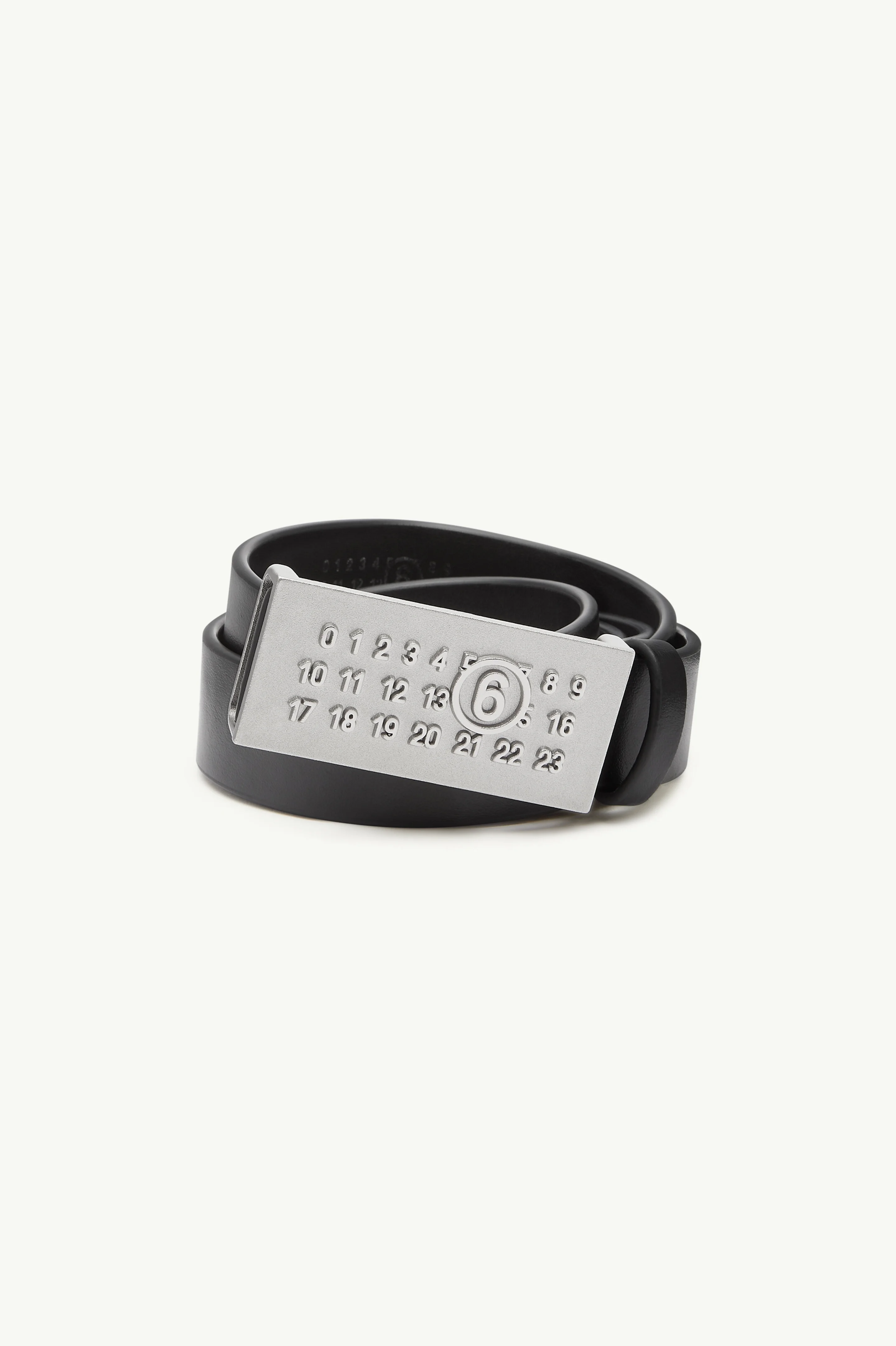 Belt with numeric signature in soft leather. The minimalist design features a belt buckle with the new MM6 debossed numbers artwork. Product Details Item ID SA6TP0010P6418T8013 Body: 100% calf leather Belt in soft leather MM6 numeric signature at the front on metal plate One size Made in Italy Belt length to the first hole: 69 cm/27 in Belt length to the last hole: 109 cm/43 in Width: 2,5 cm/1 in Clean with a gentle leather cleanser and a damp microfiber cloth