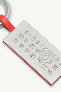 This keyring pairs a polished metallic plaque, embossed with MM6’s numeric signature, with a leather backing in vivid contrast. The Maison's horizontal white stitch line marks the back, a discreet detail that affirms its identity. Secured with a rounded fastening. Product Details Item ID SA5UA0005P8885T4020 Body: 100% calf leather Contrast: 100% zama Contrast: 100% brass Engraved numeric plaque detail Split ring with leather detail White stitch line at the back Made in Italy