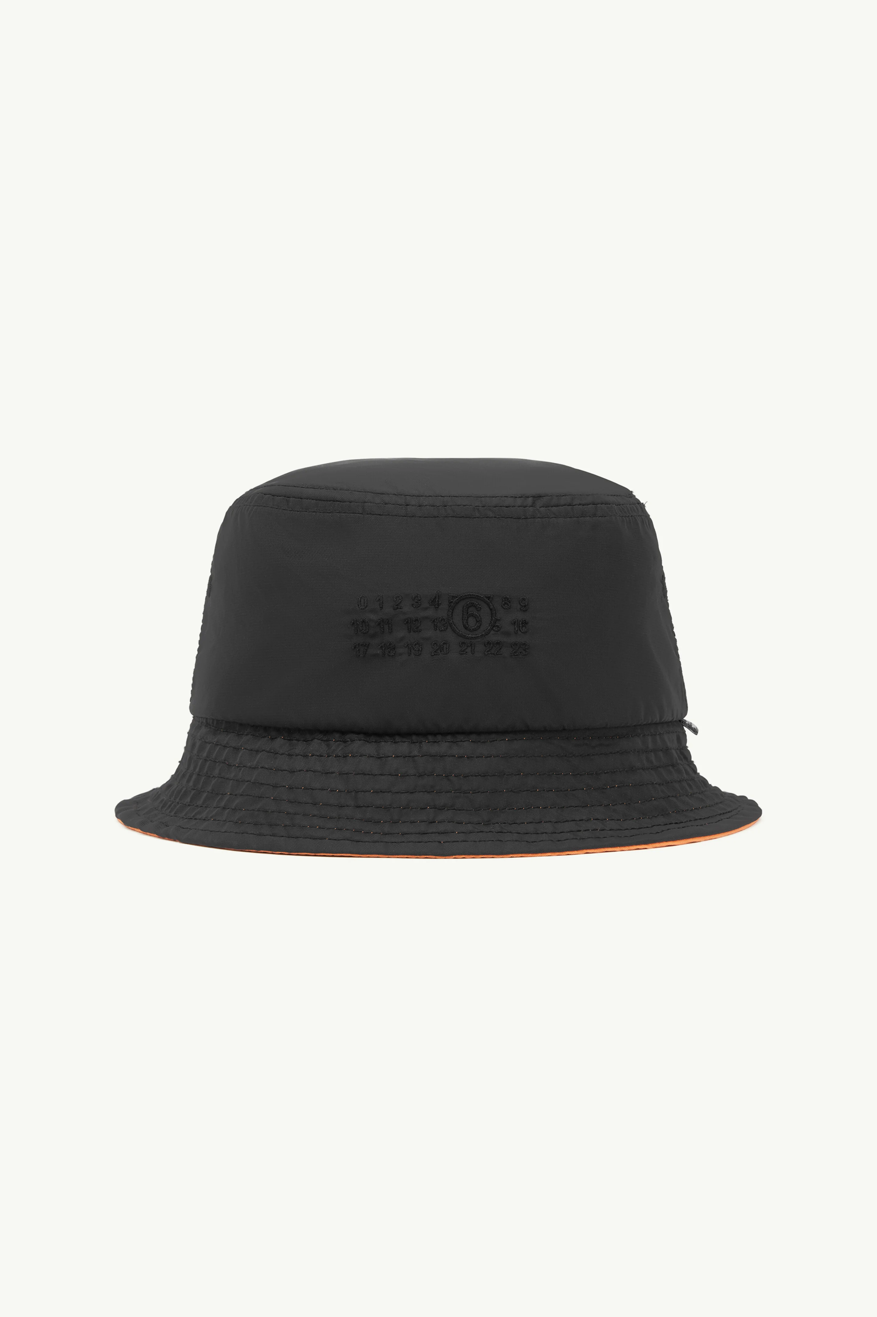 A clean bucket silhouette in cotton canvas, refined with tonal embroidery and precise stitching. The discreet numeric tab reinforces MM6’s pared-back codes. Product Details Item ID SH0TC0011M35794900 Primary fabric: 100% polyamide-nylon Embroidered numeric logo on the front Eyelet ventilation on the sides Stitched brim detailing