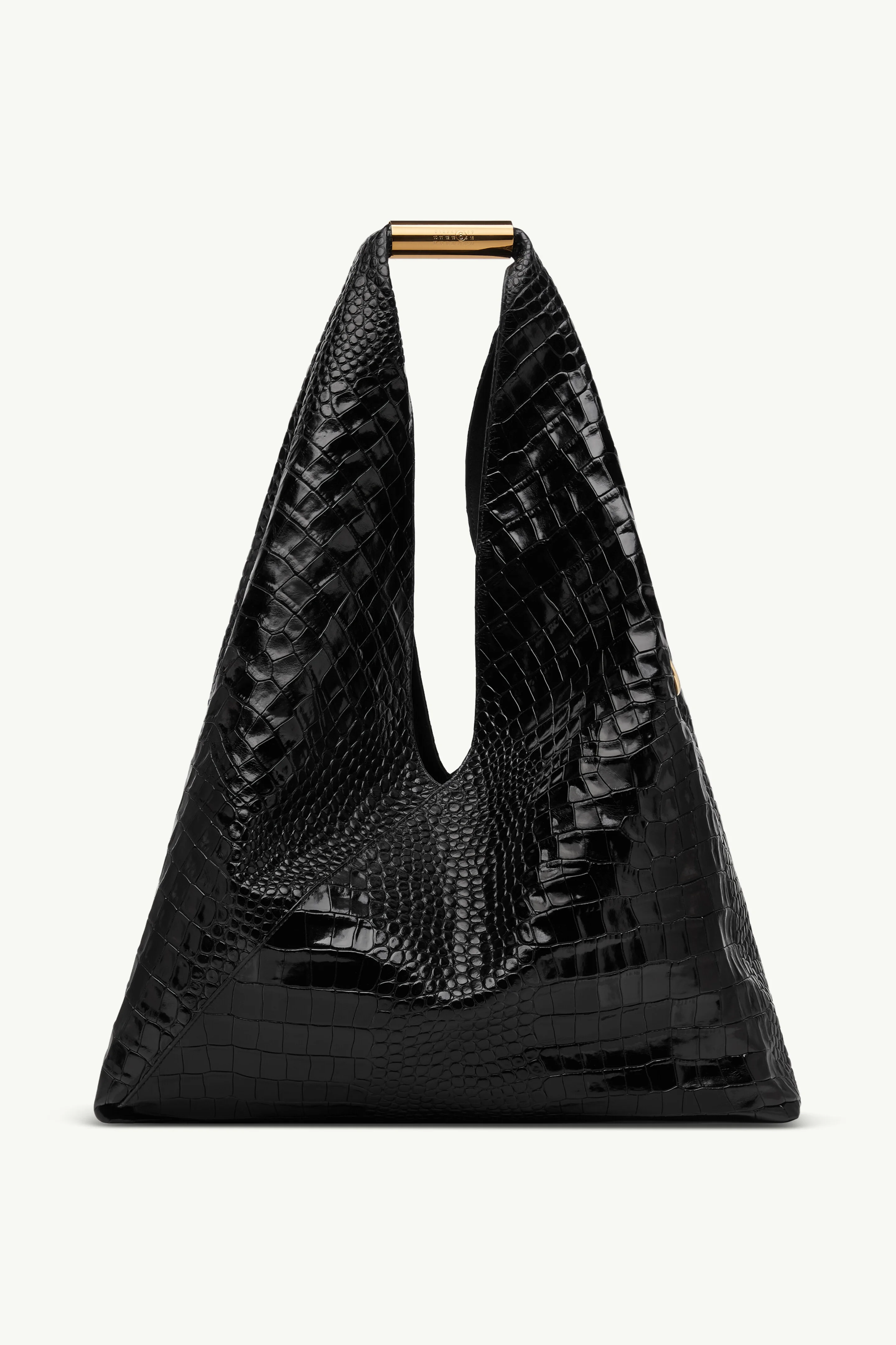 Crafted in high-shine crocodile-embossed faux leather, this oversized New Japanese bag reframes the Maison’s iconic design with amplified texture and scale. The structured silhouette and debossed signature handle echo its origami origins while lending a sculptural new dimension. Product Details Item ID SB6WD0044P8650T8013 Primary material: 100% Calf leather Secondary material: 100% Cotton Metallic hardware Oversized Japanese bag in crocodile-embossed faux leather Folded silhouette with angular construction Adjustable shoulder strap Brass handle with engraved logo White stitch line at the back