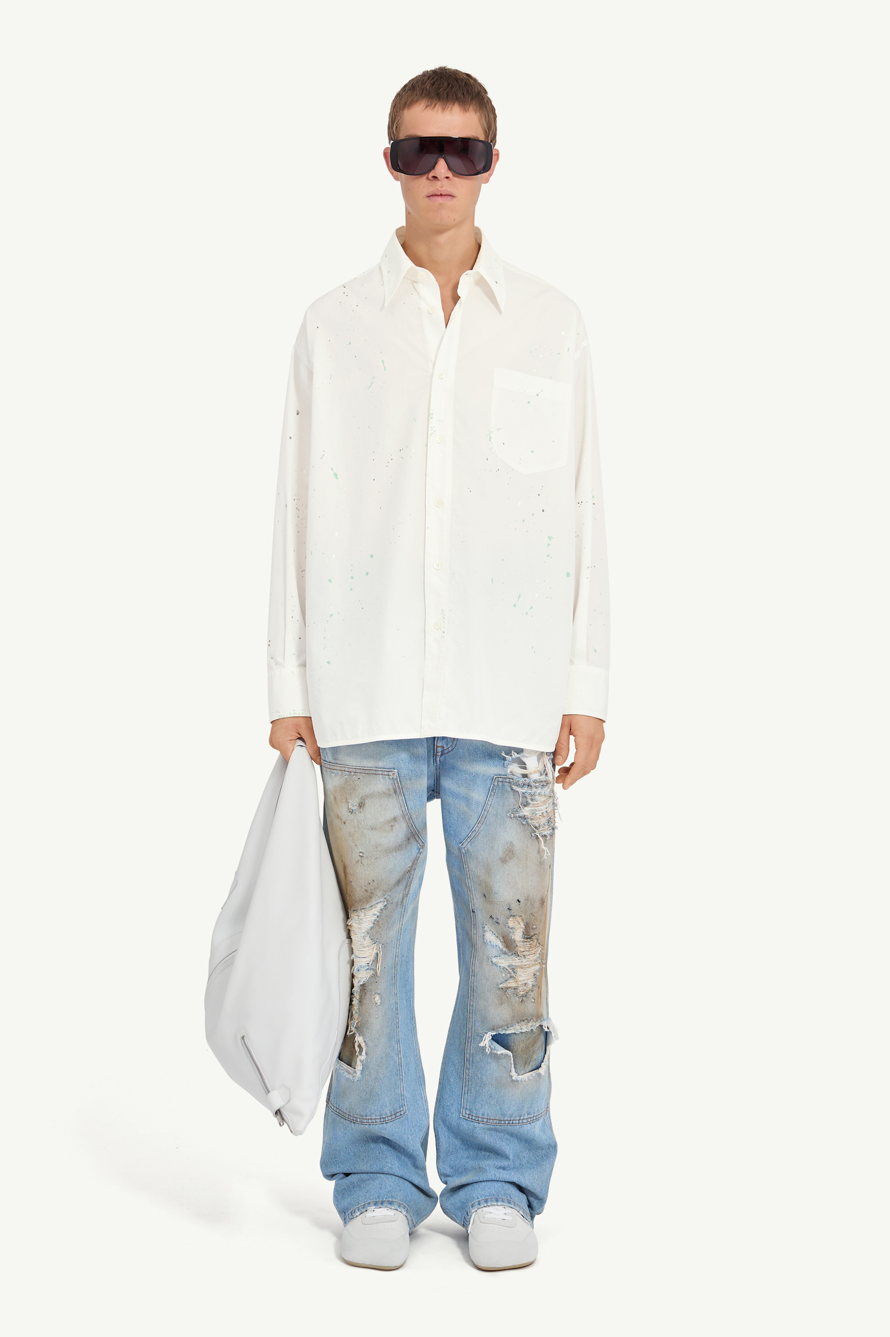 Infused with a sense of process, this white shirt features artisanal paint residue that disrupts its clean lines. A front pocket emphasises functionality, while the white stitch line at the back ties it to MM6’s deconstructed aesthetic. Product Details Item ID SH2DT0022M35458101 Primary Fabric: 100% Cotton Light cotton poplin shirt Handpainted colour splatter Pointed collar Patch pocket Front print Buttoned cuffs Side slits White stitch line at the back Made in Italy