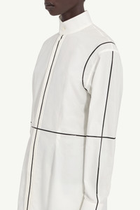 This long-sleeved shirt is made in cotton and features a high neckline and a sculpted fit, its contours shaped by seam lines that echo the markings of a dressmaker’s mannequin. A single white stitch line at the back leaves a subtle trace of the MM6 signature. Product Details Item ID S52DT0055M35256101 Primary fabric: 100% Cotton Long-sleeve shirt with stand collar High stand collar with buttons Concealed front placket with buttons Long sleeves, wide cuffs, button closure Visible seaming details with contrast piping Slightly flared hem, structured back panels White stitch line at the back Made in Italy Model is 180 cm tall and wears a size 42.