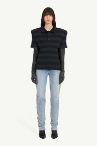 Rugby stripes meet collegiate influence in this wool-blend polo, defined by its structured ribbed knit and laid-back proportions. Marked at the back with the MM6 numeric artwork and signature white stitch line. Product Details Item ID S62GL0024M20148001S Primary fabric: 80% Wool Secondary fabric: 20% Polyamide Short-sleeve polo shirt in ribbed knit Horizontal stripe pattern Three-button placket Numeric artwork and white stitch line at the back Model is 178 cm tall and wears a size M.