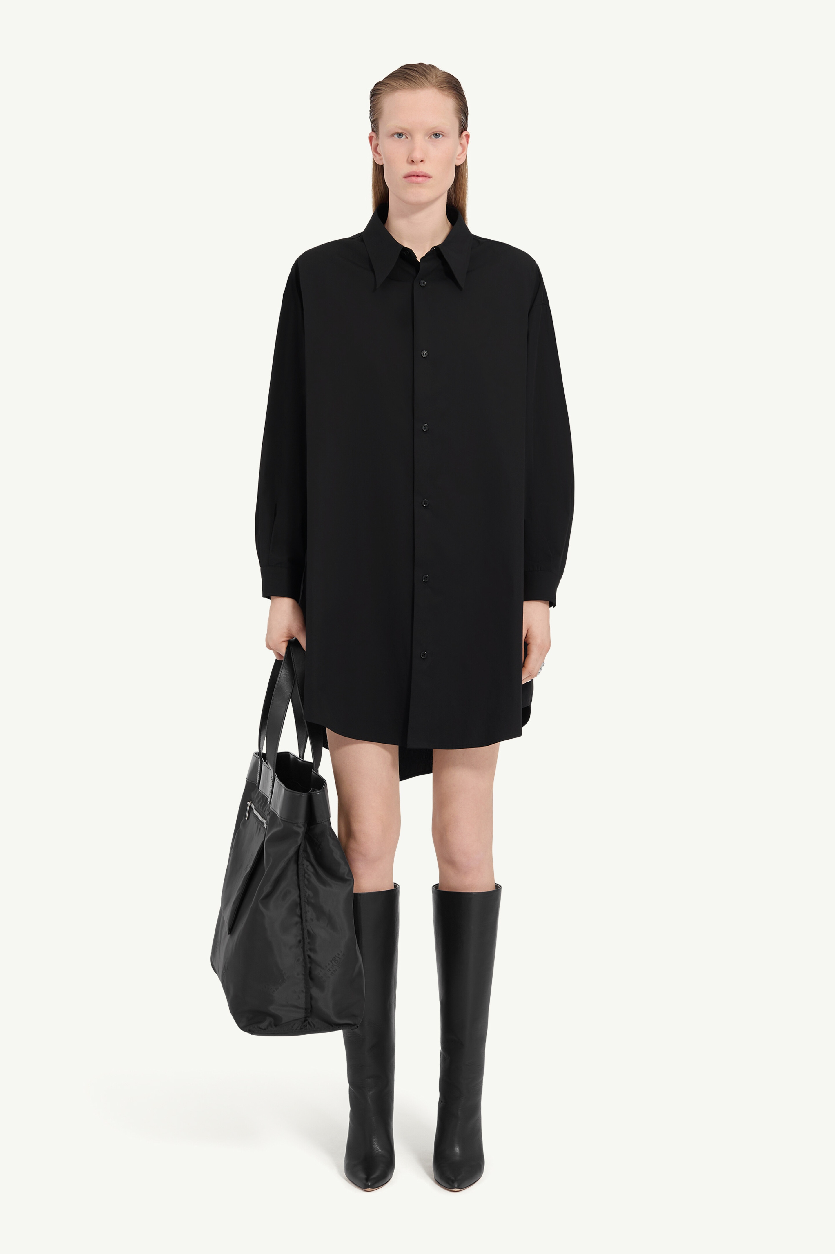 This oversized shirt dress distorts traditional tailoring with an asymmetric hem and relaxed proportions. The crisp cotton construction is punctuated by a bold yellow numeric artwork label, a graphic contrast to the monochrome palette. At the back, the white stitch line quietly reinforces MM6’s signature. Product Details Item ID S52CT0793M35480900 Primary fabric: 100% Cotton Midi-length, A-line silhouette dress Pointed collar neckline Front button closure, visible buttons Long sleeves, buttoned cuffs Dropped shoulder seams Curved hemline, longer at back Yellow rectangular patch at front White stitch line at the back Model is 180 cm tall and wears a size M.