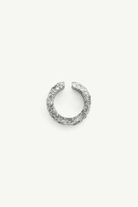 An ear cuff crafted in silver-toned brass with a crinkled foil finish. The irregular surface captures light with a sculptural intensity, transforming a utilitarian shape into a futuristic object. The Maison's engraved numeric artwork is concealed on the interior, grounding the piece in MM6’s subversive detail. Product Details Item ID SM6VG0105P6622956 Body: 100% brass One size Textured brass ear cuff Silver foil finish Engraved brand logo Avoid salt, chlorine water and aggressive liquid Made in Italy