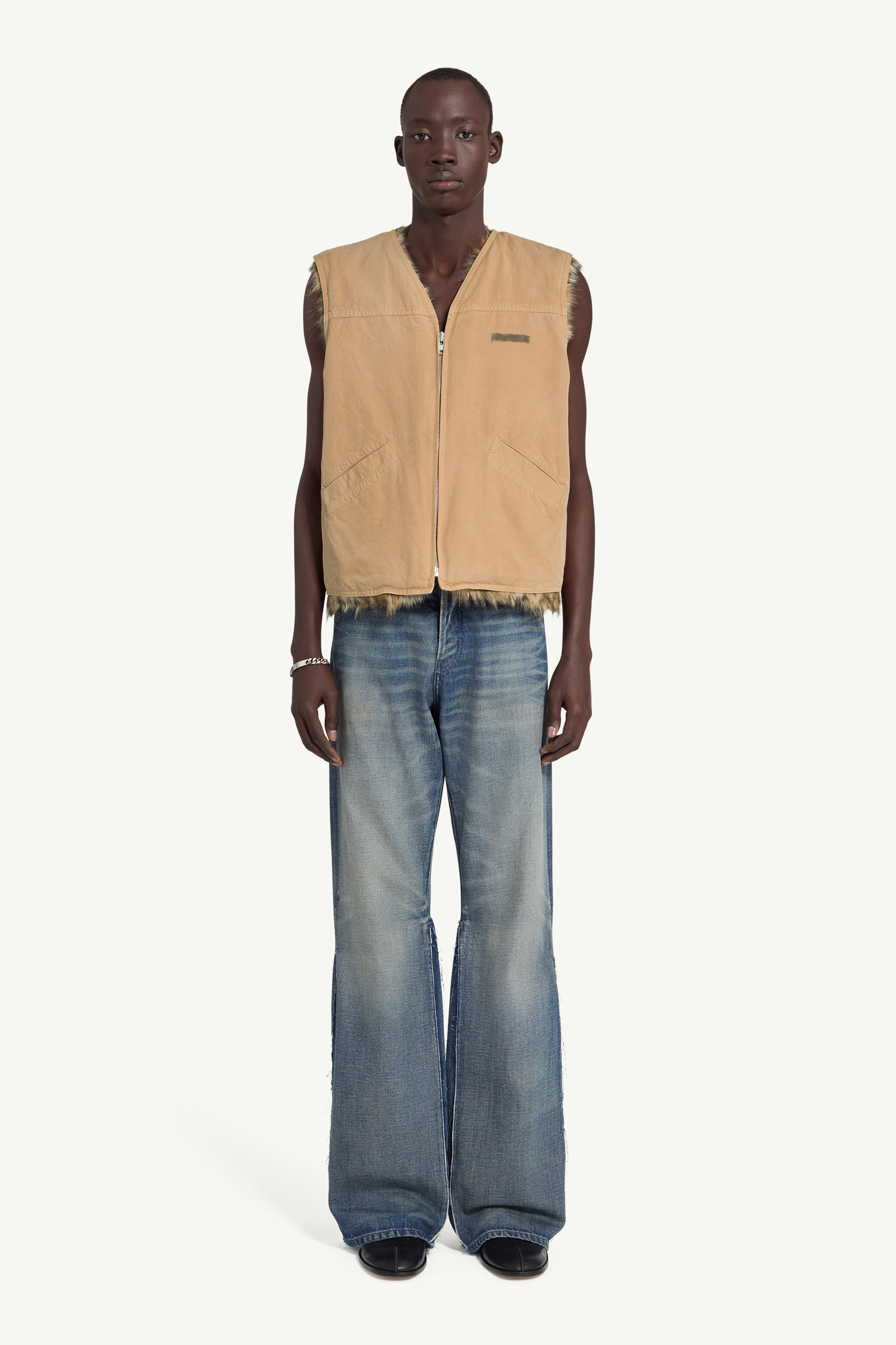 This sleeveless jacket is rendered with clean construction, then offset by a visible faux fur lining that traces the hemline and seams. Its tonal artwork is deliberately faded, which together with the MM6 white stitch line signals its identity. Product Details Item ID SH0FB0018S78548156 Primary fabric: 100% Cotton Inside: 80% Acrylic, 20% Polyester Pocket lining: 100% Cotton Sleeveless vest with faux fur trim Straight boxy silhouette, V-neckline Front with a visible silver zipper Diagonal welt pockets at the front Raw-edge detailing at armholes Faux fur trim at hemline Faded logo on upper left chest White stitch line at the back Made in Italy Model is 188 cm tall and wears a size 48.