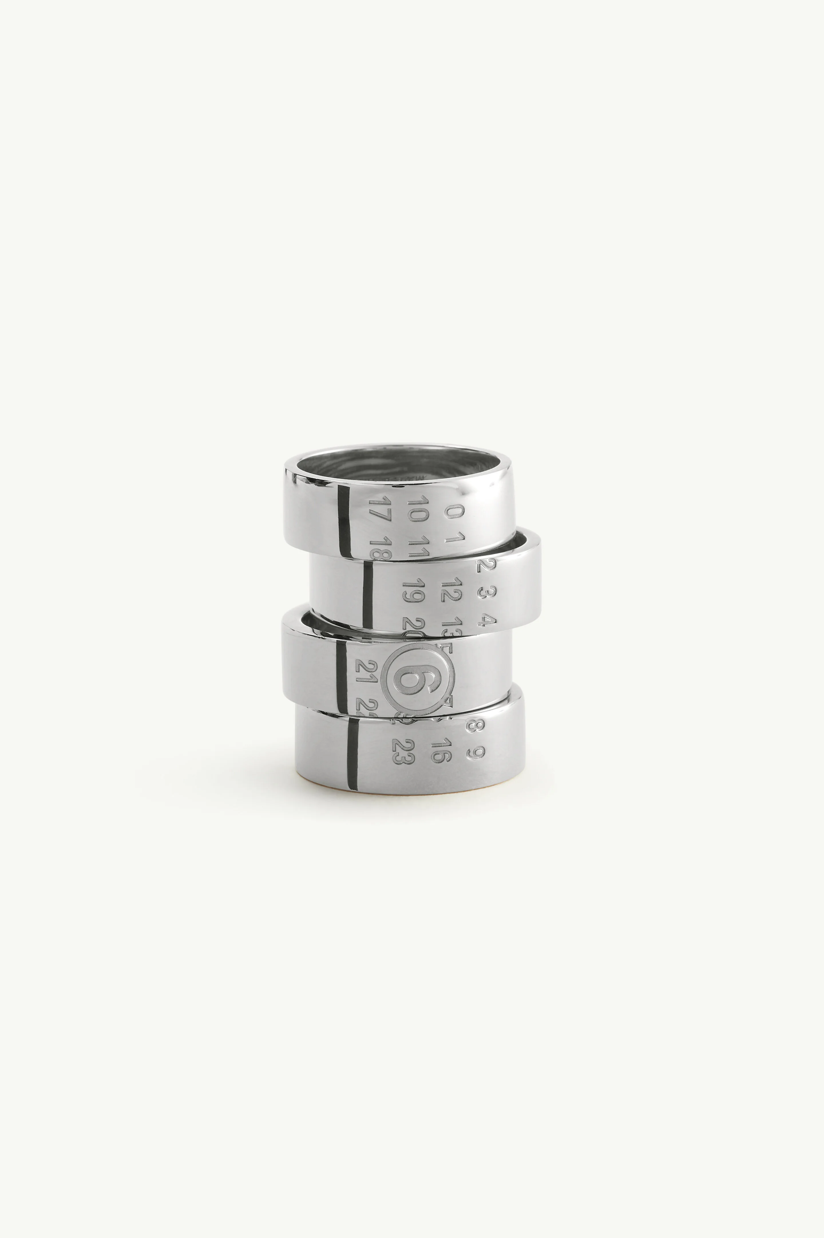 Four polished bands form a stacked composition. Together, their alignment forms the Maison's numeric signature, creating a uniform imprint that underscores MM6’s modular logic. Designed to be worn together or apart. Product Details Item ID SM7UQ0113P8754951 Primary material: 100% Silver-toned brass Stacked-effect ring in polished metal Polished finish Engraved numeric signature Made in Italy
