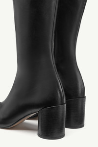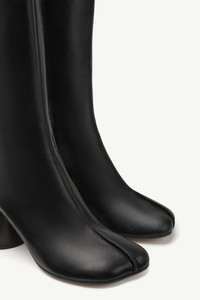 Slip on knee-high boots made from shiny leather with an anatomic toe and cylindrical heel. They hide a discreet zip closure on the inside of the style and are detailed by the brand's new stitch-out technique. MM6's discreet yet distinct signature, a horizontal white stitch line, is present on the back of the shoes. Product Details Item ID S59WW0110P5000T8013 Upper: 100% calf leather Lining: 100% calf leather Inside: 100% ovine leather Sole: 100% calf leather Heel height: 7 cm/2,8 in Boots in shiny vegetable leather Knee-height MM6 anatomic shape Cylindrical heel Zip closure on the inside White stitch line at the back Made in Spain