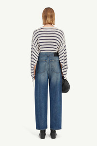 These blue denim jeans feature a high-waist, straight-leg cut that reinterprets classic denim with a contemporary edge. A button closure and sleek lines highlight their timeless appeal, while the white stitch line and MM6 numeric signature at the back underscore the Maison's unique design ethos. Product Details Item ID S52LA0235M30018965 Composition: 100% cotton Pocket lining: 65% polyester, 35% cotton Blue denim trousers High waist Straight leg Button closure White stitch line and MM6 numeric signature jacron label at the back Made in Italy