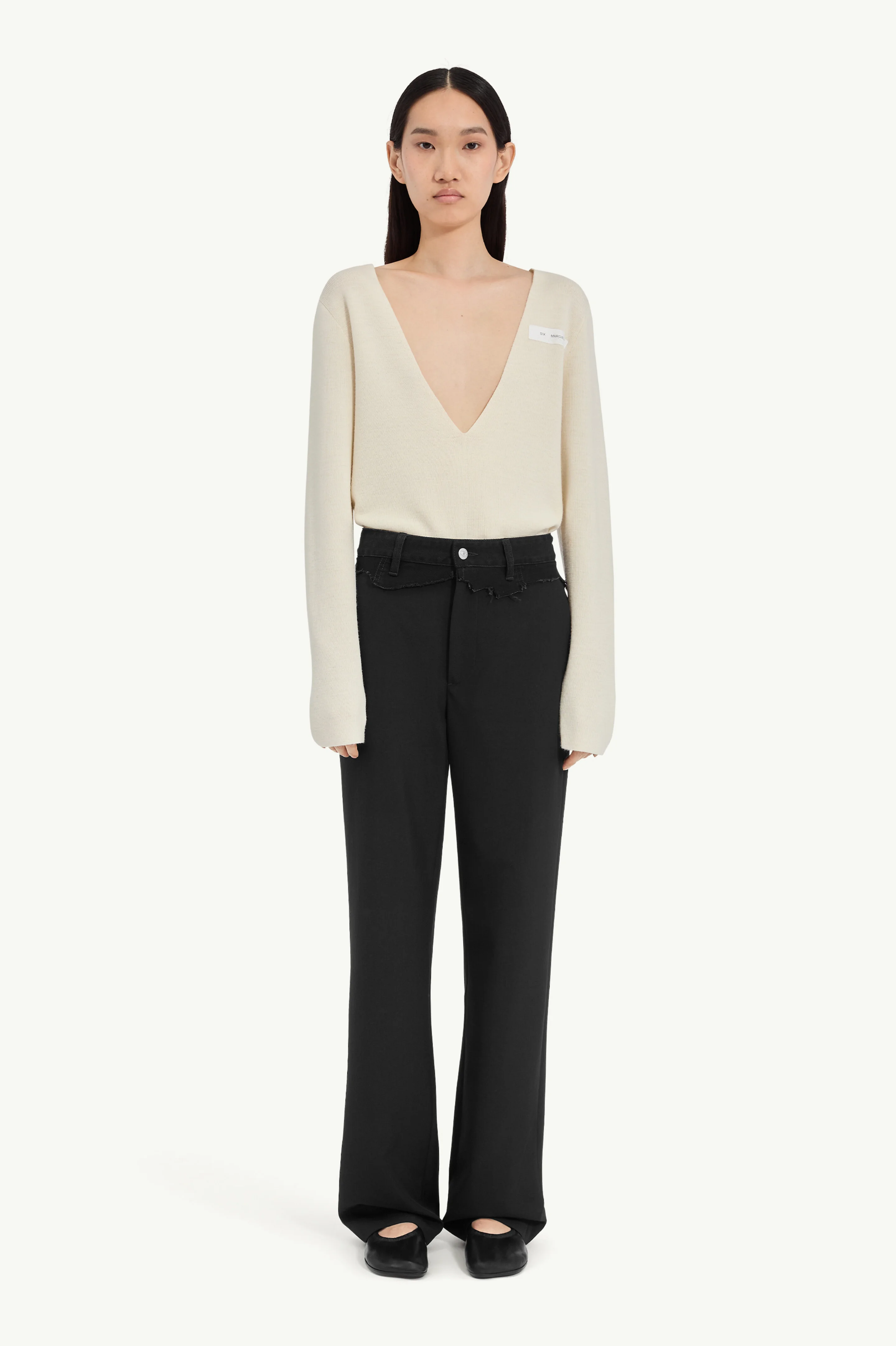 These wool-blend trousers combine tailoring with denim, featuring a raw-edged insert at the waistband that disrupts the classic line. Straight through the leg, the silhouette balances structure and subversion. The MM6 white stitch line at the back affirms its signature. Product Details Item ID S52KA0557MTN133961 Primary fabric: 55% polyester 45% virgin wool Secondary fabric: 100% cotton Pocket lining: 100% viscose-rayon Full-length wide-leg pants Raw-edge denim waistband detail Center button and zip closure at the front White stitch line at the back Made in Italy