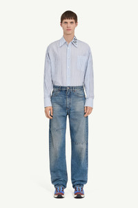 These blue denim jeans experiment with proportions through with their unconventional seam placement and tapered leg. Classic belt loops add refined practicality, while the MM6 numeric label and horizontal white stitch line to the back mark the Maison’s distinctive identity. Product Details Item ID SH0LA0009M30018965 Composition: 100% cotton Pocket lining: 65% polyester, 35% cotton Blue denim 5-pocket trousers Regular waist Belt loops Tapered leg Zip and button closure White stitch line and MM6 numeric signature jacron label Made in Italy