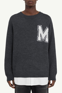 A hybrid construction that redefines classic layering. This knit sweater is fused with a white poplin shirt, creating the illusion of two garments in one. The oversized varsity-style “M” patch at the chest reinforces its collegiate inspiration while underscoring the Maison’s subversive approach to tradition. Finished with the MM6 white stitch line. Product Details Item ID SH0HL0039M13206855M Primary fabric: 50% virgin wool 50% acrylic Gauge 5 Secondary fabric: 100% cotton Varsity-style M patch on the chest Long sleeves Round neck White stitch line at the back Made in Italy