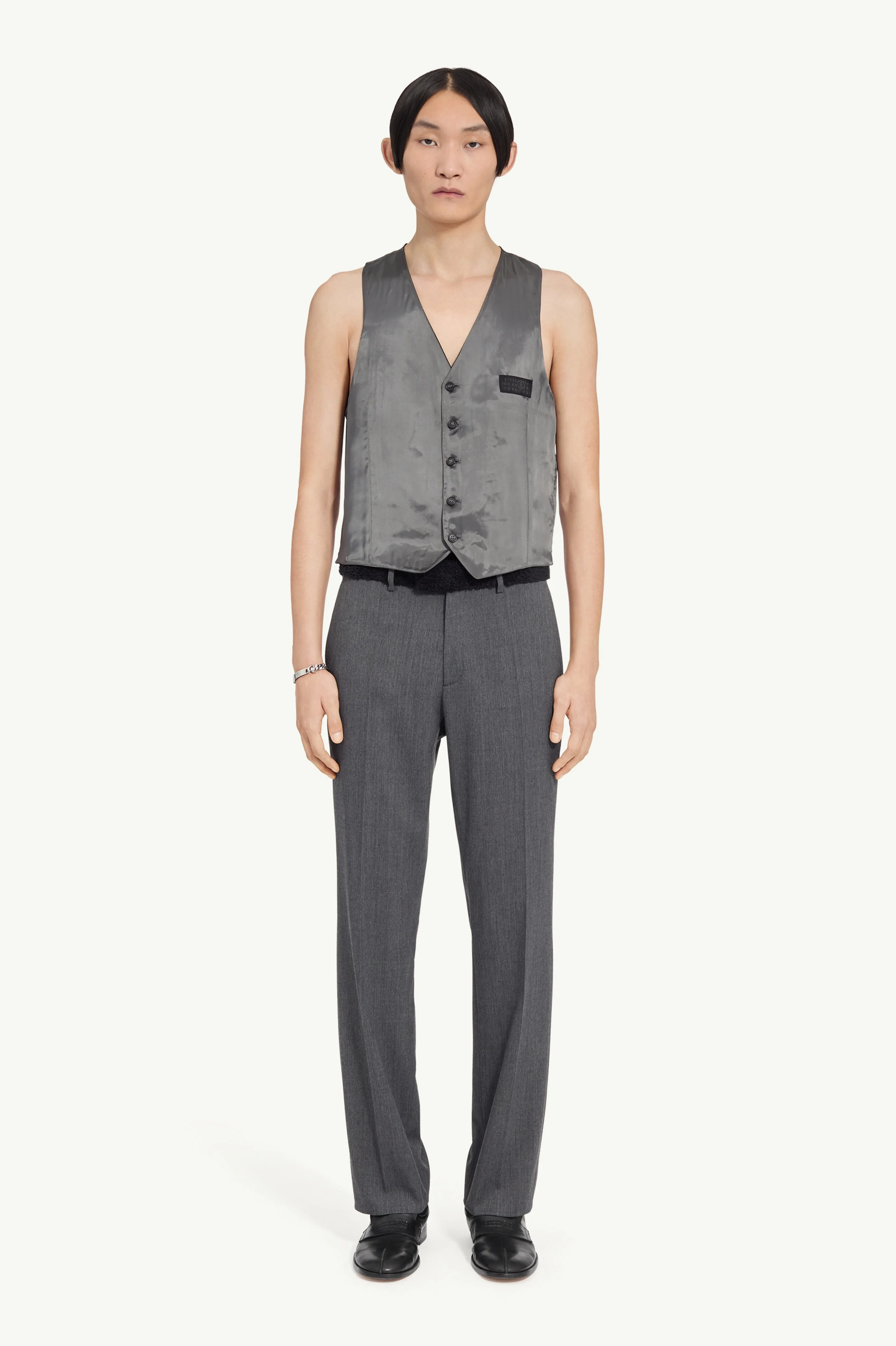 A minimalist waistcoat with softened edges, this piece features a clean, V-cut front and five-button fastening that nods to classic tailoring. Its lustrous surface is broken only by a tonal stitched pocket and an understated numeric label. At the back, MM6’s signature white stitch line adds a subtle trace of the unconventional, referencing the Maison’s identity. Product Details Item ID SH0FB0016S41355860 Primary fabric: 100% Viscose-Rayon Lining: 69% Polyester, 30% Viscose-Rayon, 1% Elastane-Spandex Sleeveless vest with V-neckline Six-button front closure Pointed hemline at the front Chest patch with printed numbers Visible panel stitching Straight back hemline White stitch line at the back Made in Italy Model is 190 cm tall and wears a size 48.