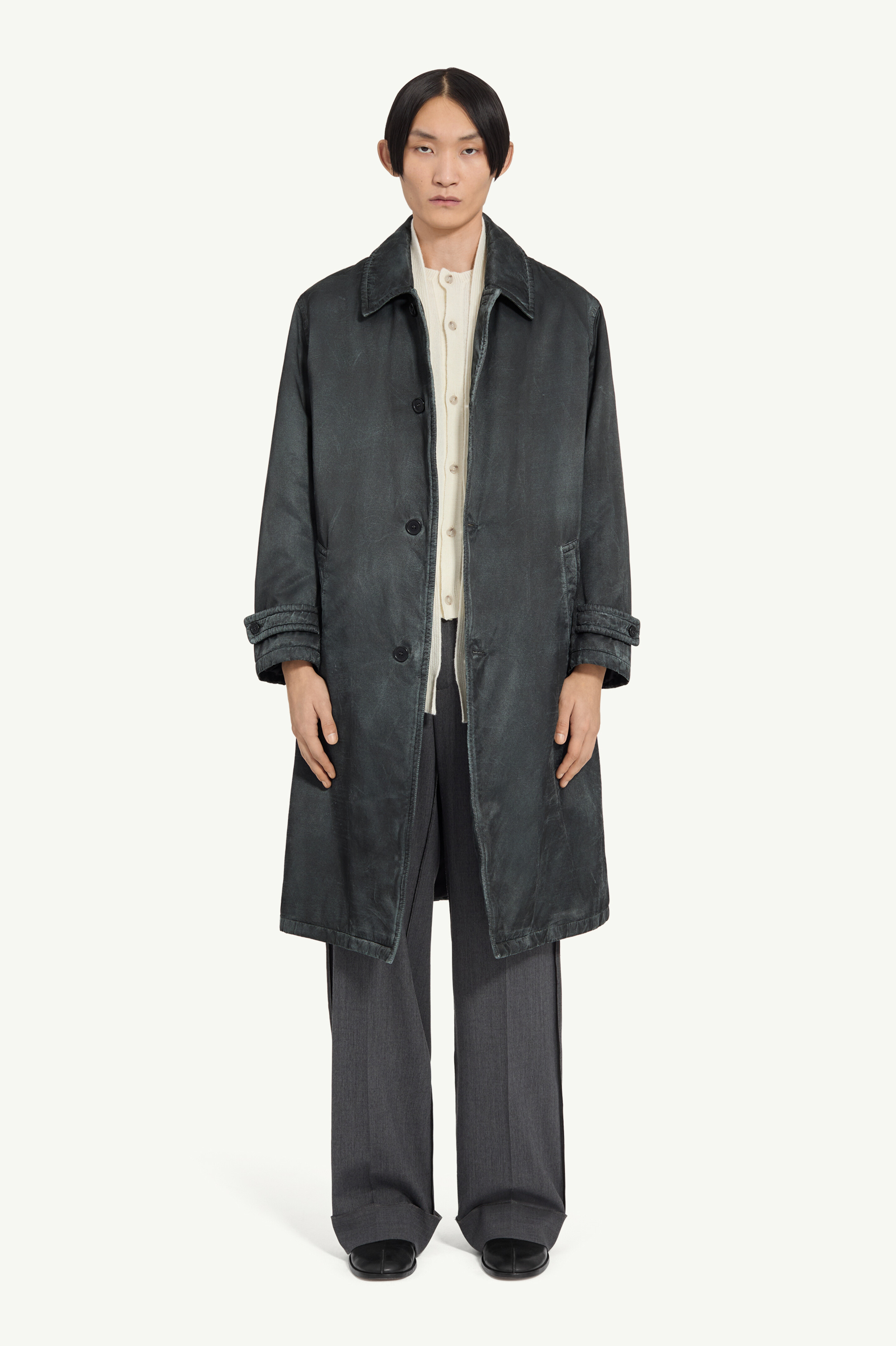 This longline coat in washed cotton balances utility and intention, softening classic structure with an uneven surface and tonal fading. Cuff adjusters and minimal buttons add to its pared-back, slightly industrial character. A single white stitch at the back identifies the garment as MM6. Product Details Item ID SH0AA0015M35452899 Primary Fabric: 57% Cotton 43% Viscose-Rayon Padding: 100% Polyester Lining: 100% Viscose-Rayon Pocket Lining: 100% Cotton Long coat with pointed collar Lightly padded with soft structure Buttoned tabs at the cuffs Welt pockets Visible seam through the rear White stitch line at the back Made in Italy Model is 190 cm tall and wears a size 48.