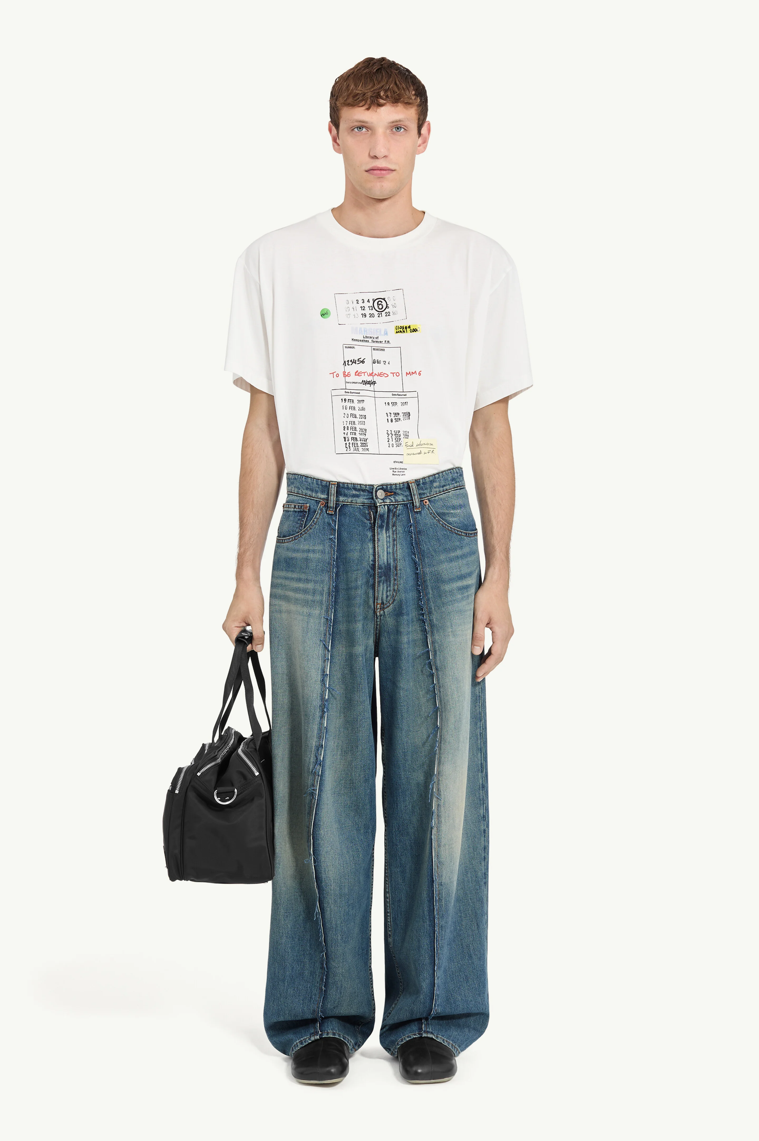 Wide-leg trousers in washed denim with an exaggerated silhouette. Distinct fading emphasises the oversized cut, while seamed panel construction disrupts the familiar five-pocket form. Finished with a tan logo patch and the MM6 white stitch line at the back. Product Details Item ID SH0LA0011M30055961 Primary fabric: 100% cotton Pocket lining: 65% polyester 35% cotton Full-length wide-leg fit Center button and zip closure White stitch line at the back