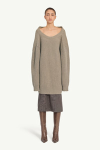 This oversized sweater dress showcases MM6’s Expansion technique with a back insert panel that unfolds to exaggerate the silhouette. With a relaxed fit, dropped shoulders and directional drape, it redefines knitwear through quiet irreverence. Finished with the white stitch line – MM6’s discreet signature. Product Details Item ID S62HL0042M13193114 Primary fabric: 80% Wool Secondary fabric: 20% Polyester Oversized sweater dress in ribbed wool blend Dropped shoulders and long sleeves Expansion panel White stitch line at the back Made in Italy Model is 180 cm tall and wears a size M.