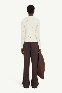 This knit cardigan disrupts traditional softness with deliberate distressing, revealing traces of a process left unfinished. Ribbed trims create contrast, holding structure against an otherwise raw aesthetic. At the back, MM6’s signature white stitch line pays quiet homage to the Maison's identity. Product Details Item ID S52HP0033M13134103 Primary Fabric: 100% Virgin Wool Fitted cardigan in virgin wool V-neckline Button front closure Distressed detailing Ribbed trims White stitch line at the back Made in Italy Model is 180 cm tall and wears a size M.