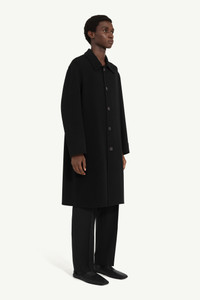 A streamlined coat in double-faced wool, cut with a relaxed shape and minimal detailing. Defined by its pointed collar and tonal buttons, the design offers a subtle play on classic tailoring. The MM6 white stitch line appears at the back. Product Details Item ID SH0AA0018M35761900 Primary fabric: 100% virgin wool Double faced wool Long sleeves Shirt collar Front button closure White stitch line at the back