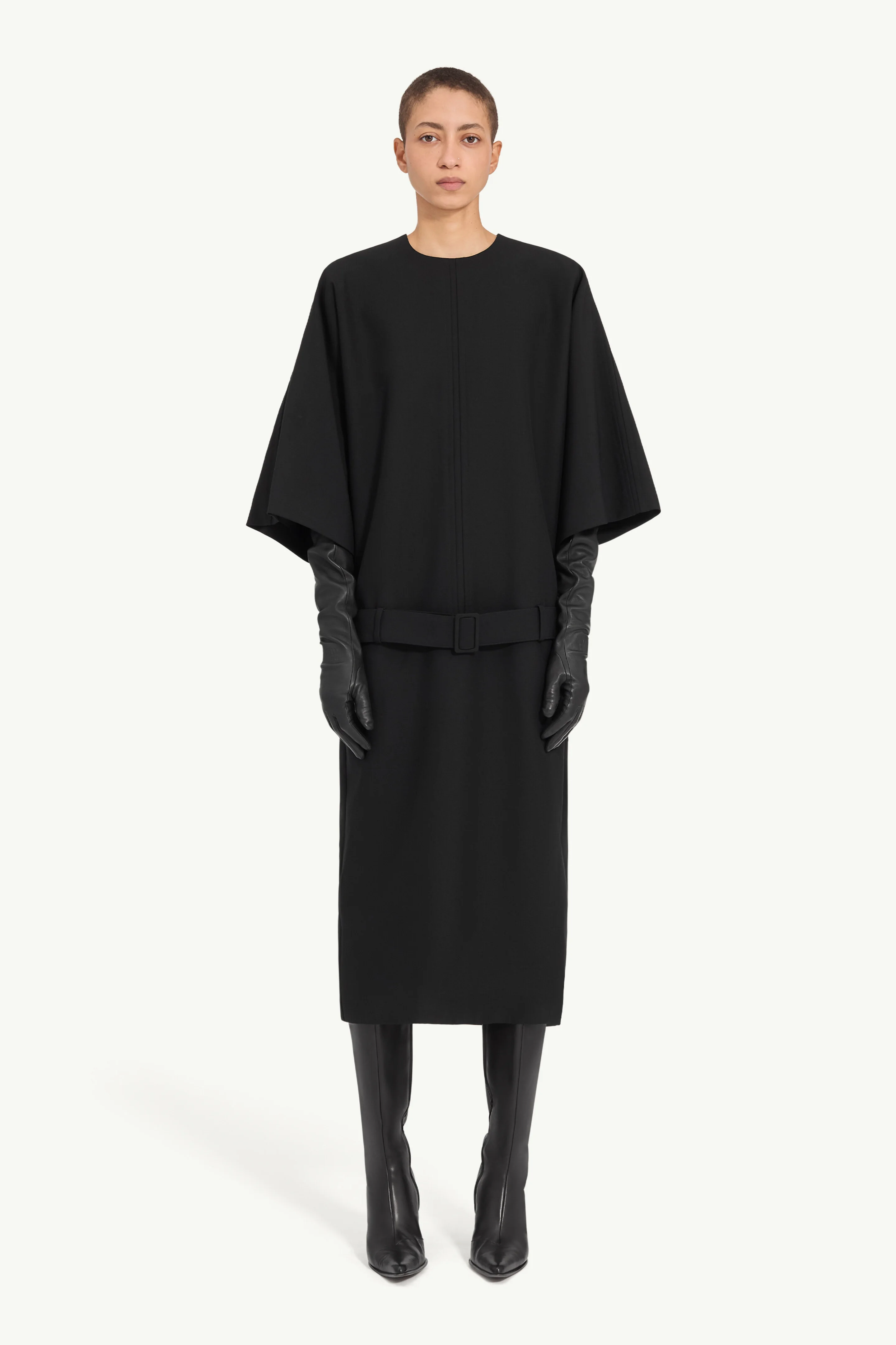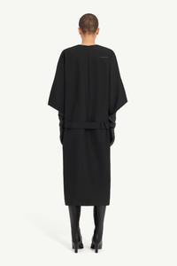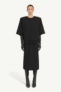 This pure wool midi dress features wide sleeves and a straight silhouette, defined by a tonal waist belt that rests gently at the hips. The minimalist design highlights MM6’s focus on shape and proportion. At the back, the MM6 white stitch line marks its signature. Product Details Item ID S62DG0055M35653900 Primary fabric: 100% wool Round neckline with centre seam Three-quarter wide sleeves Detachable tonal belt with buckle Concealed zip fastening at the back White stitch line at the back Made in Italy Model is 180 cm tall and wears a size 42.