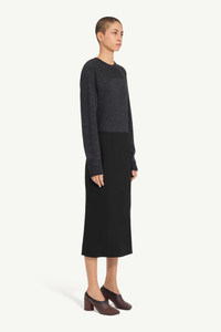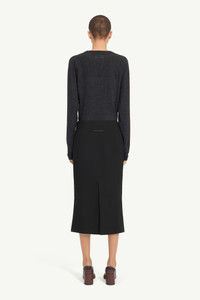A clean-lined silhouette with subtle construction details. This straight-cut midi skirt is detailed with vertical seams and a centre-back slit to soften its architectural feel. At the back, the MM6 white stitch line asserts its signature. Product Details Item ID S62ME0017M35622900 Primary fabric: 98% Virgin Wool Secondary fabric: 2% Elastane Midi-length skirt Vertical seam detailing front and back Concealed side zip fastening Centre-back slit White stitch line at the back Made in Italy Model is 180 cm tall and wears a size 42.