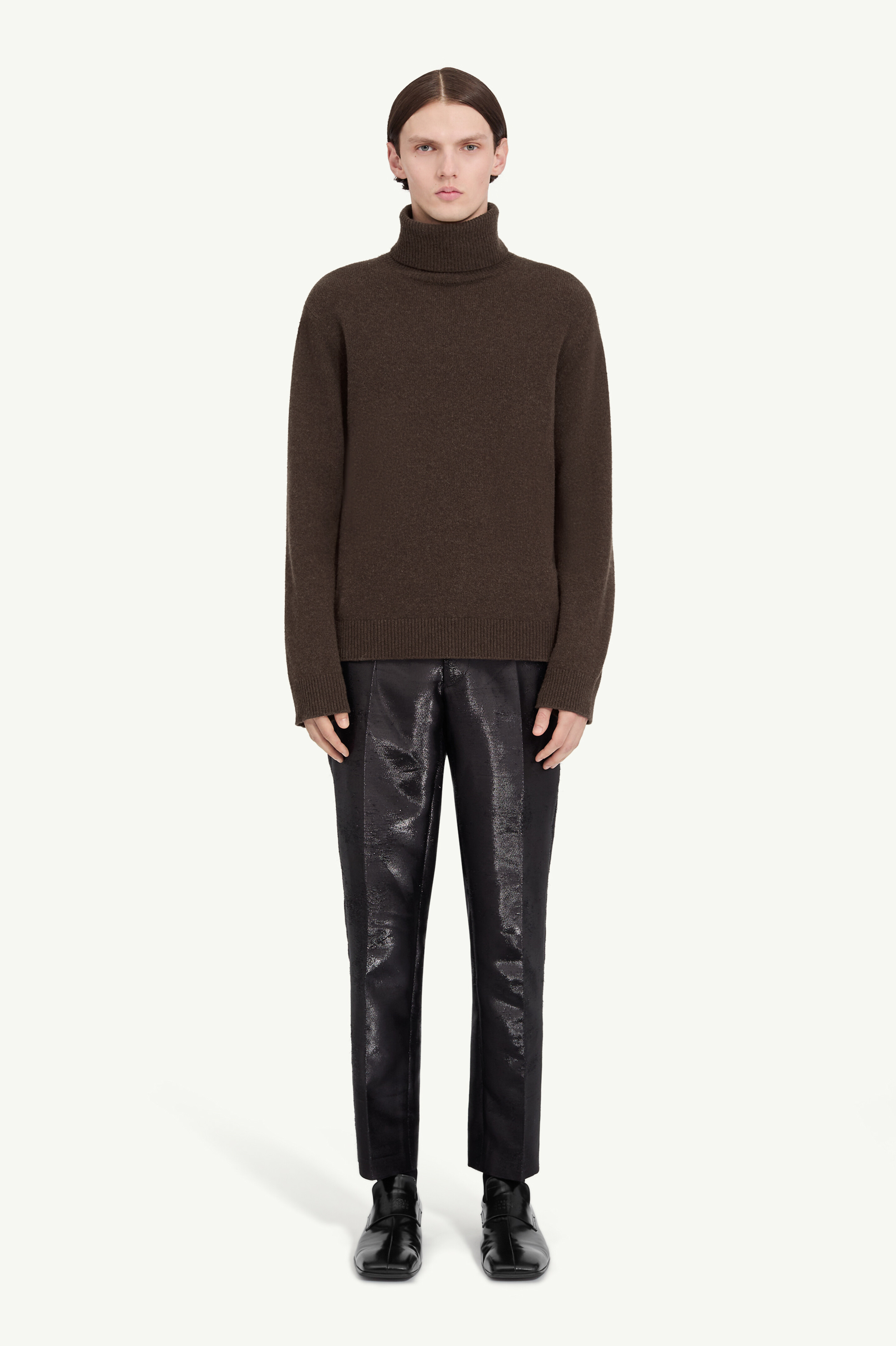 This turtleneck is shaped using MM6’s reduced panel technique – where oversized garments are downsized. Cut in a soft wool blend, it features a high ribbed neck and exposed seam at the back, with surplus fabric left untouched to reveal the process. Finished with the Maison's numeric artwork, subversively split in two. Product Details Item ID SH2HA0012M13187144 Primary fabric: 80% Wool, 20% Polyamide Long-sleeve turtleneck sweater Reduced panel construction Exposed seam at the back Ribbed cuffs, collar and hem Dual numeric patches at the back Made in Italy Model is 186 cm tall and wears a size M.