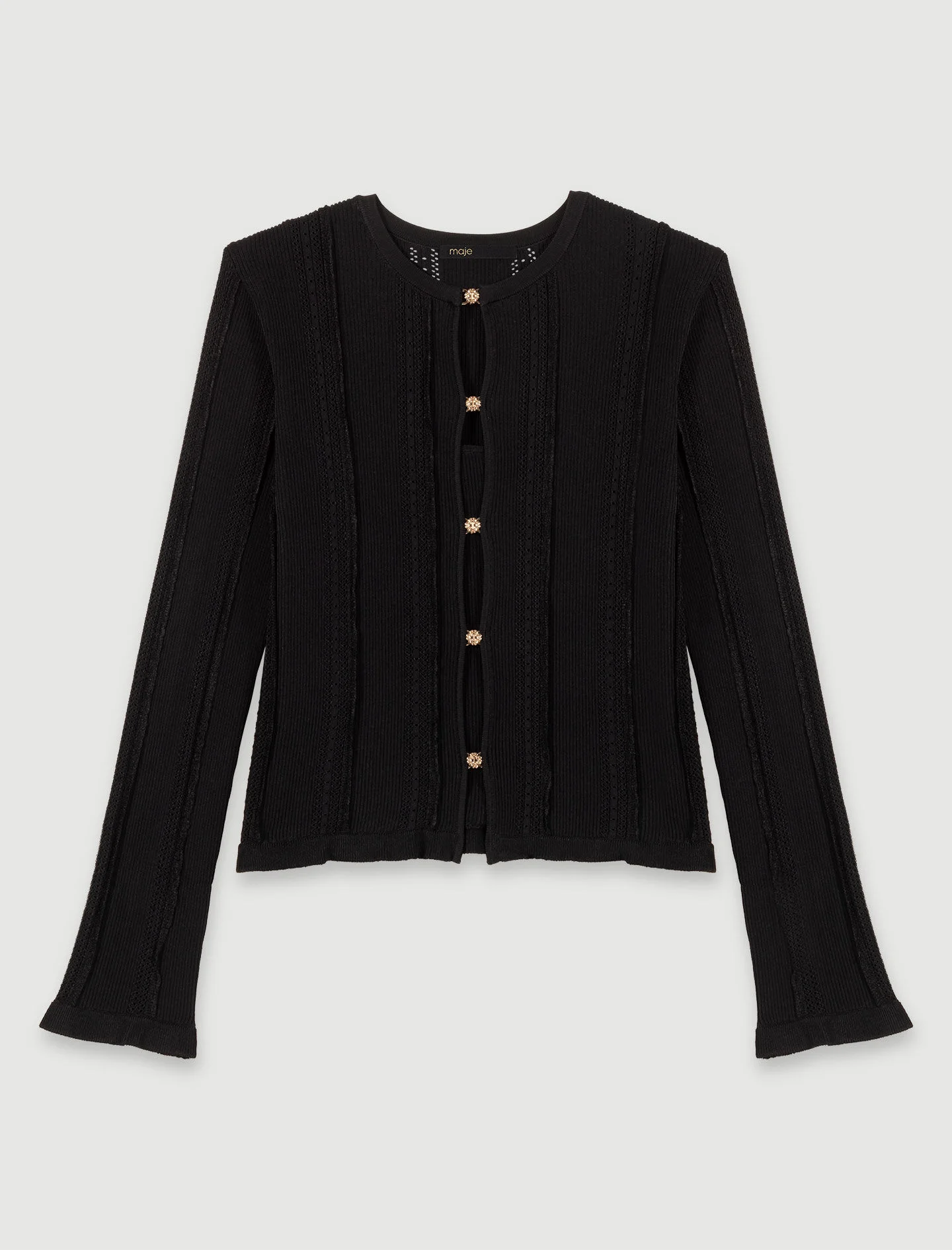2-in-1 cardigan This season, the studio pays tribute to the celebratory spirit and timeless elegance of French fashion. An ode to glamour and sophistication, each piece embodies a party vibe and a sense of celebration, redefining chic with a touch of daring. Both chic and versatile, this 2-in-1 twin set in openwork knit with stripes offers a host of possibilities. Comprising a camisole tank top with thin straps and a long-sleeved cardigan with Clover clip-on buttons, it can also be worn separately, depending on your mood and style for the day. Mix and match it with trousers and ballet flats for an elegant, casual outfit. - Openwork knit twin set - Cropped cardigan in openwork knit with stripes - Round neck - Clip-on Clover button fastening - Long-sleeved with flared cuffs - Short camisole top with thin straps Reference: MFPCA00526_2517 Composition & care Main material: 75% viscose, 21% polyamide, 4% elastane Neckline: 85% viscose, 12% polyamide, 3% elastane Rib: 75% viscose, 21% polyamide, 4% elastane Hand wash Do not bleach Do not tumble dry Iron at a maximum temperature of 110°C without steam F - Professional dry clean, with hydrocarbon solvent, normal treatment