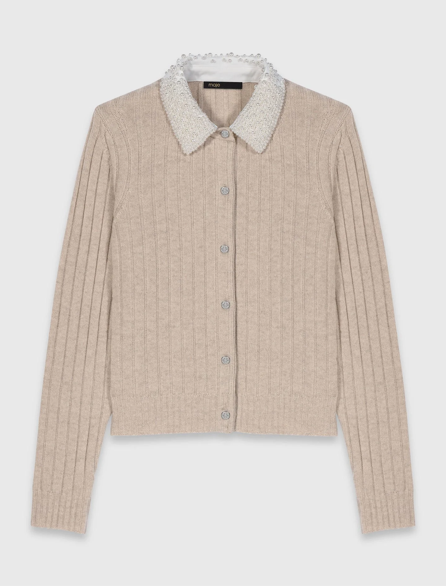 Cardigan with removable bead collar Each season, the collection imagines urban, sophisticated and free-spirited silhouettes, where every detail counts. This beige rib knit cardigan reveals a close-fitting cut and a removable collar adorned with pearls, contrasting with the soft matte knit and the metal buttons engraved with the signature clover. For an assertive look, pair it with wide-leg faded jeans, a mini Miss M bag and brown loafers for a chic and casual mix, punctuated by a thin belt with a gold buckle. - Cardigan with removable collar embroidered with pearls - Fitted wool rib knit - Round silver-tone logo buttons - Fitted cut - Ribbed trim on the cuffs and waist The model is 5' 10 and wears a size FR 1. Reference: MFPCA00674_0130 Composition & care Main material: 94% wool, 5% polyamide, 1% elastane Removable collar: 94% polyester, 6% elastane Rib: 80% wool, 17% polyamide, 3% elastane Hand wash Do not bleach Do not tumble dry Iron at a maximum temperature of 110°C without steam Do not dry clean