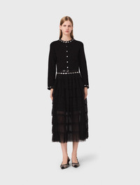 Cropped jewellery detail cardigan This season, bold black pieces and precious accessories enhance every silhouette, for a look that is radiant, intense and refined. This cropped knit cardigan stands out with its rhinestone-decorated collar and cuffs, adding a luminous touch to the silhouette. Its braided trim and jewel buttons reinforce its elegant and sophisticated look.Pair with the matching dress for a sophisticated total look, or wear on its own with high-waisted jeans for a chic, modern contrast. - Knit cardigan - Rhinestone-embellished collar - Braided trim - Button fastening and two patch pockets The model is 5' 10 and wears a size 1. Reference: MFPCA00645_2517 Composition & care Main material: 59% viscose, 40% polyamide, 1% elastane Braid: 98% viscose, 1% elastane, 1% polyamide Hand wash Do not bleach Do not tumble dry Iron at a maximum temperature of 110°C without steam Do not dry clean