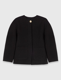 Double-faced coat Maje's seasonal wardrobe unveils structured pieces with enveloping fabrics and impeccable cuts. This black jacket is clean and sophisticated, with a sculptural drape that subtly accentuates the waist. Its soft texture offers comfort and warmth all season long, while the jewellery-style button adds a precious touch. Wear with flowing trousers and a contrasting shirt, and accessorise with a fringed bag and pointed-toe pumps. - Short double-faced wool jacket - Round neck, rounded sleeves and structured volume - Placket fastening with a gold jewellery-style button - Two patch pockets on the front - Designed for a tailored fit The model is 5' 10 and wears a size 36. Reference: MFPVE00750_2517 Composition & care Main material: 80% wool, 20% polyamide Do not wash Do not bleach Do not tumble dry Iron at a maximum temperature of 110°C without steam F/ - Professional dry clean, with hydrocarbon solvent, gentle treatment