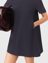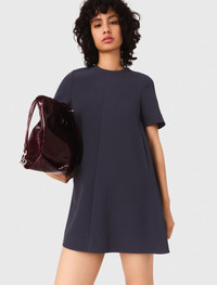 Heavy crepe trapeze dress The collection opts for simple elegance, offering easy-to-wear pieces with clean lines. This short dress features a slightly flared cut, balanced by short sleeves and a structured round neck. Accessorise with the season's signature pieces: a burgundy bag and matching ballet flats. - Short dress with a round neck and short sleeves - Slightly flared cut - Two side pockets - Designed for a boxy fit The model is 5' 9 and wears a size 36. Reference: MFPRO04316_0103 Composition & care Main material: 92% polyester, 8% elastane Hand wash Do not bleach Do not tumble dry Iron at a maximum temperature of 110°C without steam F/ - Professional dry clean, with hydrocarbon solvent, gentle treatment