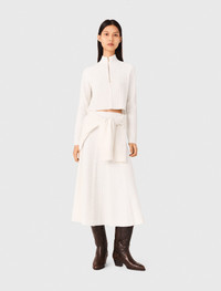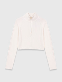 High-neck sweater This season is all about detailed knits, designed to bring comfort and character to your figure. The shapes are fluid and the details precise, offering pieces that are both practical and elegant. This long-sleeved cable-knit jumper has a short, structured fit, balanced by a zip-up high neck that can be worn as open or closed as you like. Worn with a midi knit skirt and high boots, it creates a feminine and assertive silhouette with a modern, casual elegance. - Textured cable-knit jumper - Cropped fit - Zip-up high neck - Designed for a slim fit The model is 5' 11 and wears a size 1. Reference: MFPPU00934_0101 Composition & care Main material: 42% polyester, 28% polyamide, 22% acrylic, 8% wool Tab: 46% polyester, 23% polyamide, 21% acrylic, 10% wool Collar: 45% polyester, 23% acrylic, 23% polyamide, 9% wool Hand wash Do not bleach Do not tumble dry Iron at a maximum temperature of 110°C without steam F - Professional dry clean, with hydrocarbon solvent, normal treatment