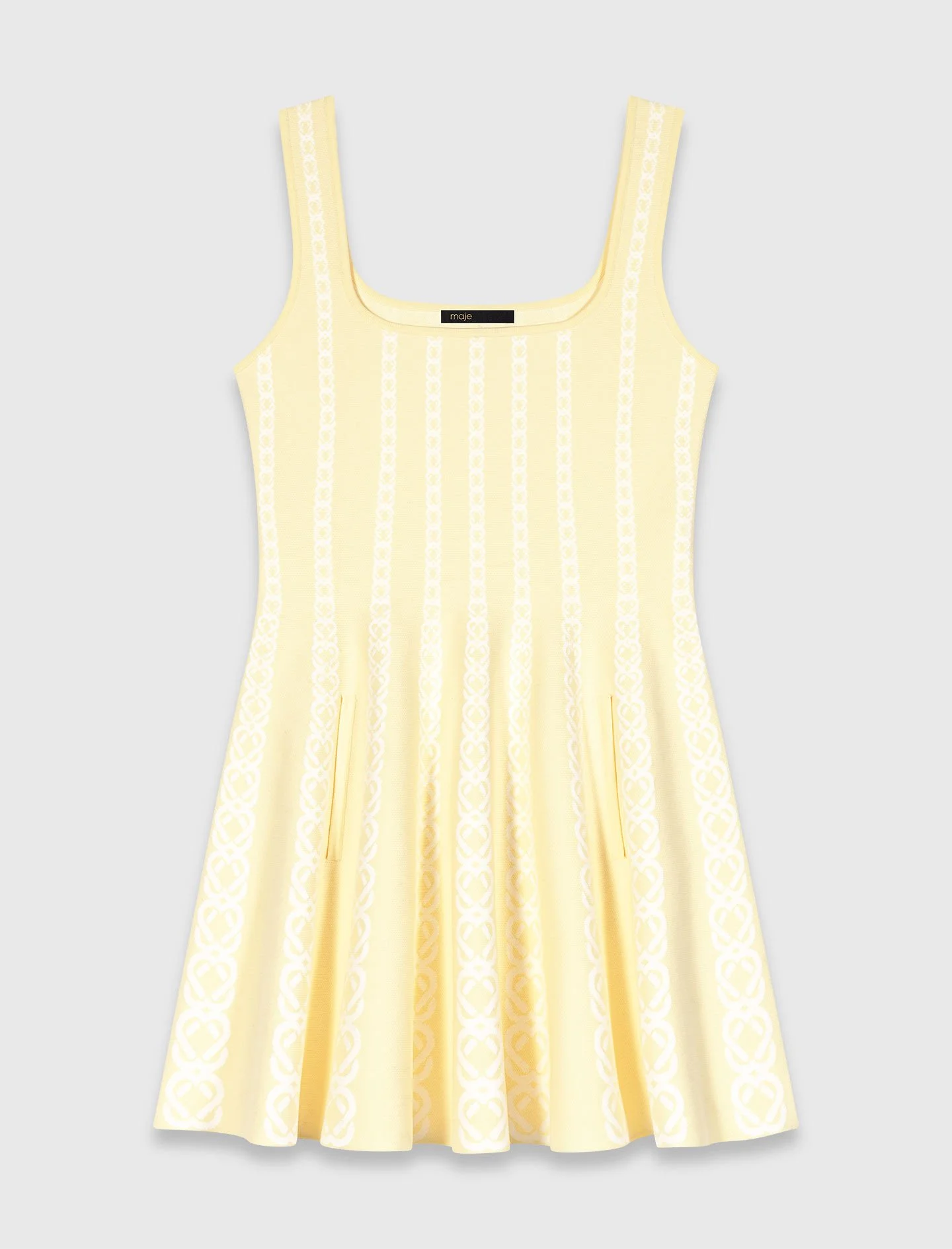 Jacquard knit short dress Embrace urban energy: this dress is a joyful, graphic piece, perfect for bringing elegance and boldness to your everyday life. Its jacquard knit features geometric stripes, while the flared skater cut sculpts the waist and allows for freedom of movement. The square neckline and wide straps add structure, while the discreet pockets add a practical touch. For a statement look, pair it with platform loafers, ribbed socks and the dual-material tote bag. - Short jacquard knit skater dress - Graphic motifs - Square neckline at the front and back - Wide, structuring straps - 2 discreet slit pockets The model is 5' 10 and wears a size FR 36. Reference: MFPRO04568_0259 Composition & care Main material: 83% polyester, 15% polyamide, 2% elastane Rib: 83% polyester, 15% polyamide, 2% elastane Hand wash Do not bleach Do not tumble dry Iron at a maximum temperature of 110°C without steam F - Professional dry clean, with hydrocarbon solvent, normal treatment