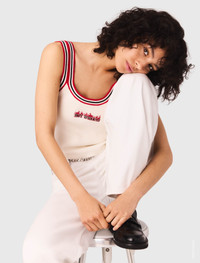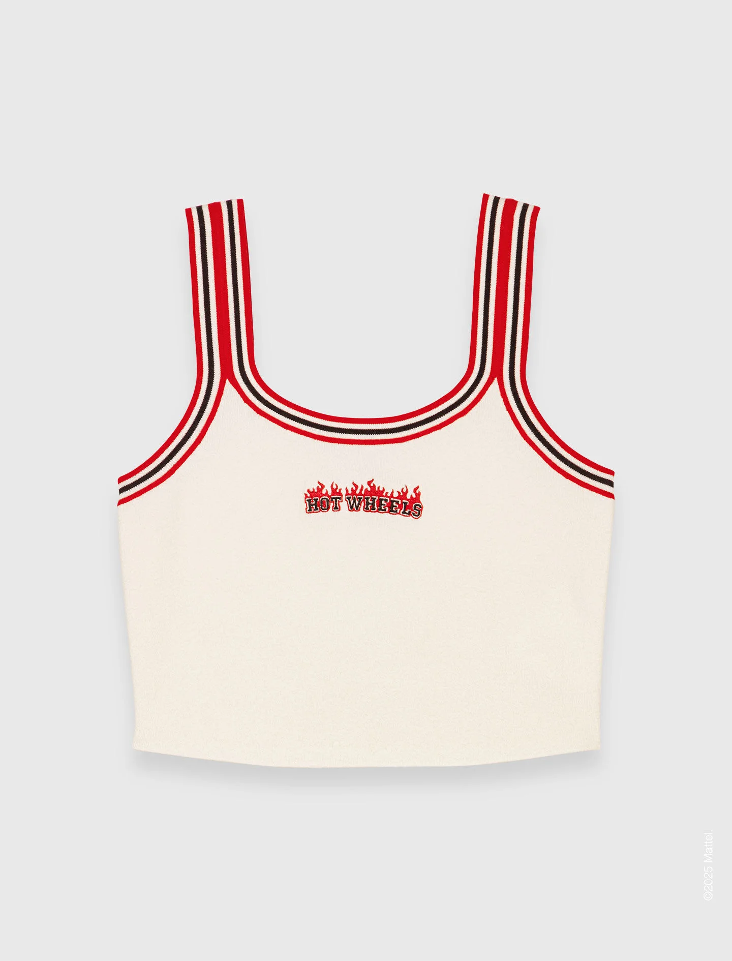 Knit crop top Hot Wheels™ x Maje This summer, Maje is teaming up with Hot Wheels™, the iconic miniature car brand and pop culture phenomenon. Parisian elegance meets racetrack energy in a collection of assertive femininity, where wardrobe essentials are inspired by motorsport themes to instil a new attitude. With its close-fitting cut and contrasting details, this knitted tank top makes a sporty statement. A flame embroidery on the front gives it a bold look. - Hot Wheels™ x Maje knit tank top - Round neck and straps - Contrasting trim - Flame embroidery - Designed for a standard fit The model is 5' 9 and wears a size 1. Reference: MFPTO01208_10 Composition & care Main material: 57% cotton, 26% wool, 15% polyamide, 2% elastane Strap: 58% cotton, 25% wool, 15% polyamide, 2% elastane Embroidery: 100% viscose Hand wash Do not bleach Do not tumble dry Iron at a maximum temperature of 110°C without steam F - Professional dry clean, with hydrocarbon solvent, normal treatment