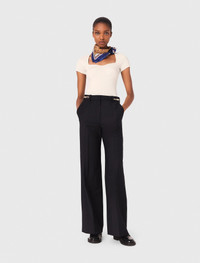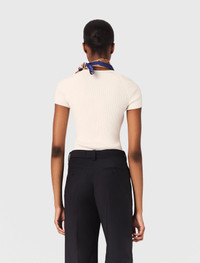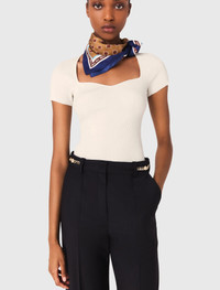 Knit top This season, the studio has conjured up a dainty, casual wardrobe where timeless pieces have been reinvented with daring tailoring and feminine details. This rib knit and stretch top has a second-skin effect and is a must-have for season after season. It has short sleeves as well as attractive topstitch details on the chest and a square sweetheart neckline. It's easy to mix and match and goes well with loose-fit trousers, a bag and sandals. - Square sweetheart neckline top - Ribbed knit - Topstitching Reference: MFPPU00775_0101 Composition & care Main material: 55% viscose, 43% polyamide, 2% elastane Rib: 56% viscose, 42% polyamide, 2% elastane Hand wash Do not bleach Do not tumble dry Iron at a maximum temperature of 110°C without steam F - Professional dry clean, with hydrocarbon solvent, normal treatment