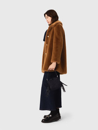 Mid-length faux fur coat This season, Maje is reinventing the essentials to wrap you up in softness and modernity. A statement piece with a soft, comforting feel. This mid-length faux fur coat elegantly envelops your figure in a warm brown reminiscent of retro styles. The notched collar and gold buttons enhance its couture look, perfect for keeping warm in style. Pair it with a denim shirt and raw wide-leg trousers, and complete the look with patent loafers and a small fringed bag. - Mid-length faux fur coat - Straight, loose fit - Double-breasted fastening with gold buttons - Oversized notched collar - Designed for a boxy fit The model is 5' 10 and wears a size 36. Reference: MFPOU01356_G005 Composition & care Main material: 100% polyester Lining: 55% polyester, 45% viscose Regular cycle 30° Do not bleach Do not tumble dry Iron at a maximum temperature of 110°C without steam F/ - Professional dry clean, with hydrocarbon solvent, gentle treatment