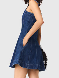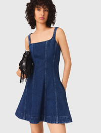 Mini denim dress A major trend this season, denim makes a comeback with this short dress, combining style and femininity. With its flared cut, it creates a look that is both trendy and structured. Featuring a round neckline and straps, it has pockets and a back fastening. - Short denim dress - Round neckline and straps - Flared skirt - Back zip fastening - 2 pockets - Designed for a slightly tailored fit The model is 5' 9 and wears a size 36. Reference: MFPRO04393_D035 Composition & care Main material: 99% cotton, 1% elastane Lining: 67% polyester, 33% cotton Regular cycle 30° Do not bleach Do not tumble dry Iron at a maximum temperature of 110°C without steam F - Professional dry clean, with hydrocarbon solvent, normal treatment