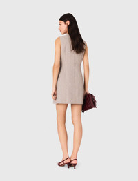 Mini rhinestone tailored dress The collection revisits tailoring classics with boldness and light, for an eye-catching silhouette. This sleeveless short dress strikes the perfect balance between structure and sparkle, with its rhinestone-striped pattern and assertive tailored cut. Sleeveless and featuring a round neck, it has a buttoned front fastening and flap pockets. Wear it on its own for a dressed-up version or pair it with a white shirt for a more casual look, complete with burgundy accessories, a must-have this season: a signature bag and pointed heels. - Short tailored-style dress with striped rhinestones - Press-stud fastening - Two front flap pockets - Designed for a tailored fit The model is 5' 10 and wears a size 36. Reference: MFPRO04266_0641 Composition & care Main material: 95% polyester, 3% elastane, 2% viscose Lining: 100% viscose Do not wash Do not bleach Do not tumble dry Iron at a maximum temperature of 110°C without steam F - Professional dry clean, with hydrocarbon solvent, normal treatment