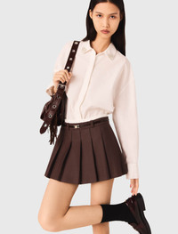 Pleated skort This skort perfectly embodies the Maje preppy look with a twist. Its 2-in-1 design combines comfort and style, thanks to a contrasting elasticated waist and a slim belt punctuated with the signature Clover. The crisp pleats structure the volume for a confident silhouette. Wear it with an embroidered-collar shirt or a close-fitting knit to accentuate the chic college vibe, and complete the look with patent loafers and a textured bag for a retro metropolitan touch. - Pleated 2-in-1 skort - Contrasting elasticated waist with a slim Clover-buckle belt - Short, structured cut with regular pleats - Zip fastening at the back - Designed for a standard fit The model is 5' 11 and wears a size 36. Reference: MFPSH00694_G005 Composition & care Main material: 52% polyester, 26% wool, 18% viscose, 4% elastane Lining: 100% viscose Inner fabric: 100% polyester Do not wash Do not bleach Do not tumble dry Iron at a maximum temperature of 110°C without steam F/ - Professional dry clean, with hydrocarbon solvent, gentle treatment