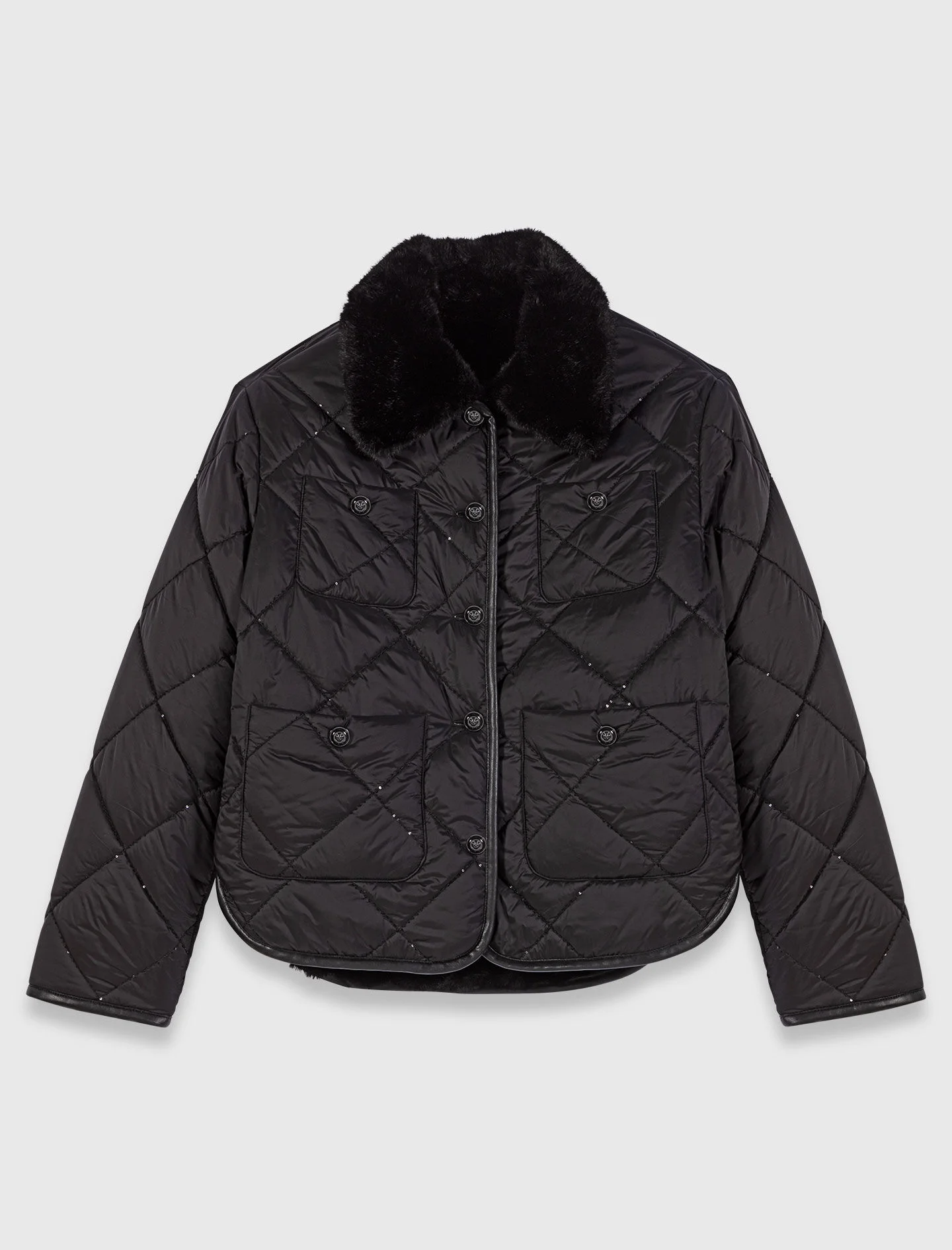 Reversible sequin puffer jacket This season, Maje is reinventing the essentials to envelop your figure in softness and modernity. Reversible, this coat plays on contrasts between a soft, fur-like texture and a quilted effect dotted with discreet sequins. Its loose fit and generous collar give it an assertive style, offering versatile wear. Add a pleated skirt and flat boots to balance the volume, and complete the look with a beanie and a black fringed bag. - Short reversible coat - Faux fur side - Sequin puffer jacket side - Designed for an oversized fit The model is 5' 10 and wears a size 36. Reference: MFPOU01351_2517 Composition & care Main material: 100% polyester Lining: 100% viscose Bias binding: 55% cotton, 45% polyurethane Secondary material: 100% polyamide Do not wash Do not bleach Do not tumble dry Do not iron F/ - Professional dry clean, with hydrocarbon solvent, gentle treatment
