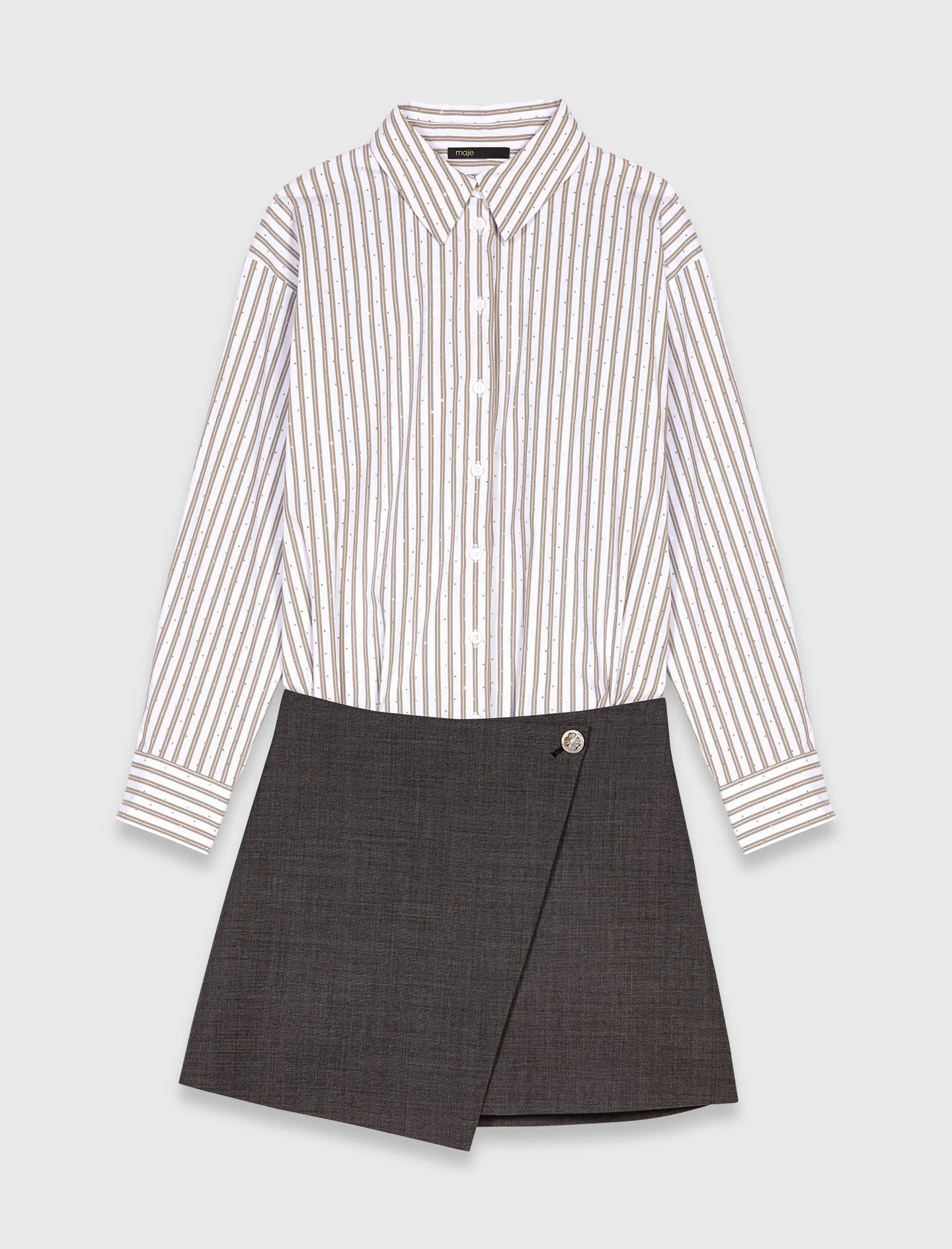 Rhinestone 2-in-1 cotton dress The collection explores the contrasts between light and structure, with hybrid pieces designed to play with styles. This striped shirt dress with rhinestones stands out with its removable skirt featuring an asymmetrical panel, accentuated by an iconic Clover button. A versatile piece, designed to easily multiply looks. Wear it as is or deconstructed to boldly vary silhouettes, and accessorise with an oversized bag and pointed heels. - 2-in-1 striped shirt dress with rhinestones - Shirt collar and long sleeves with buttoned cuffs - Removable skirt with asymmetrical panel and Clover button - Designed for a boxy fit The model is 5' 10 and wears a size 36. Reference: MFPRO04269_Q007 Composition & care Main material: 79% cotton, 18% polyamide, 3% elastane Secondary material: 53% polyester, 26% virgin wool, 17% viscose, 4% elastane Inner fabric: 100% polyester Hand wash Do not bleach Do not tumble dry Iron at a maximum temperature of 110°C without steam Do not dry clean